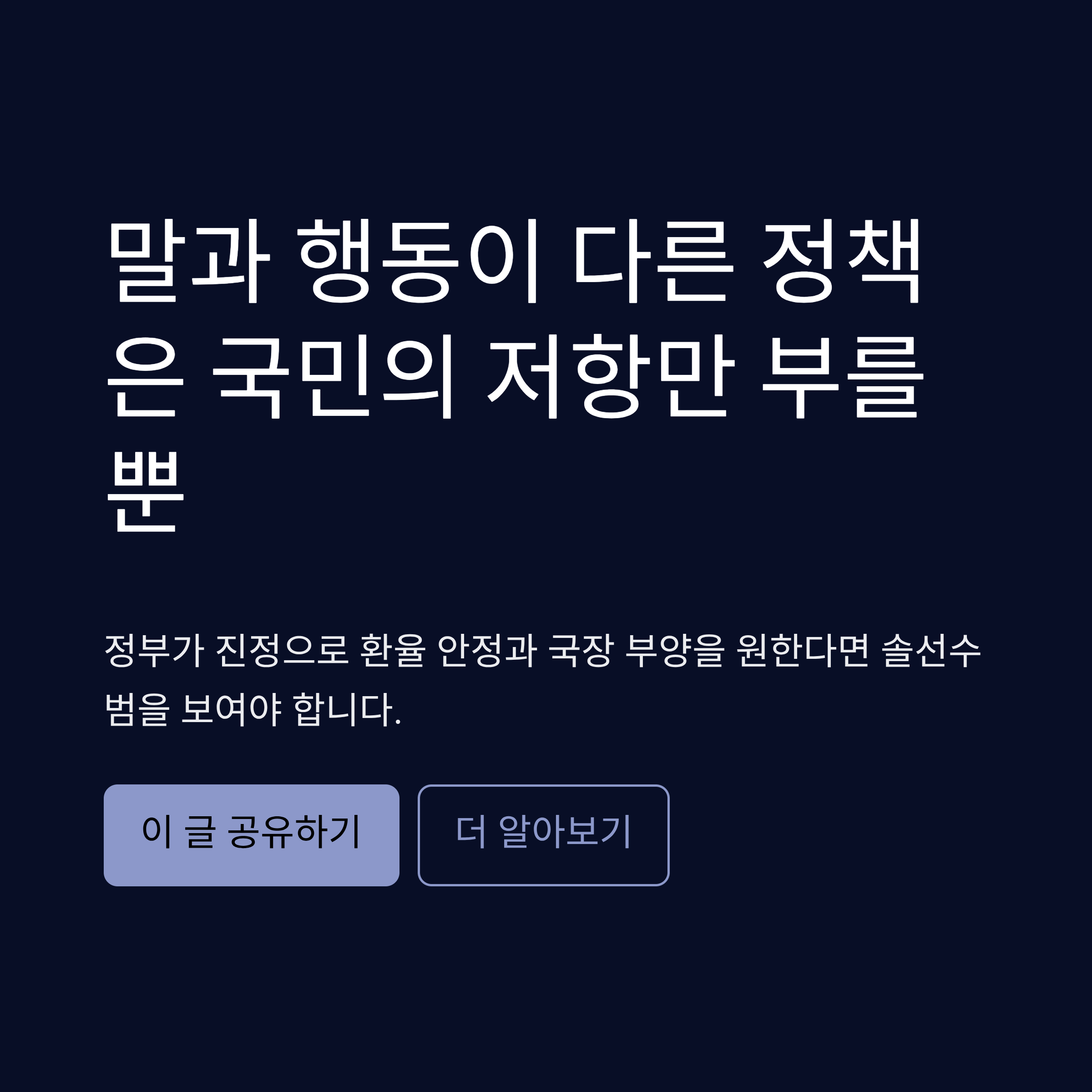 이번 사태는 단순한 공직자의 재산 형성 문제를 넘어, 이재명 정부의 정책 신뢰도를 뿌리째 흔드는 사안입니다. 환율 급등의 책임을 국민에게 돌리면서 정작 고위 공직자들은 달러 자산과 부동산으로 부를 축적하는 모습은 과거 정권의 실패를 답습하고 있다는 비판을 피하기 어렵습니다. "나 자신이 살지 않는 곳의 집은 처분하라"던 이재명 대통령의 과거 발언이 무색하게, 측근들조차 이를 지키지 않고 있습니다. 정부가 진정으로 환율 안정과 국장 부양, 부동산 시장 정상화를 원한다면, 참모진부터 해외 주식과 다주택을 처분하는 '솔선수범'을 보여야 합니다. 말과 행동이 다른 정책은 국민의 저항만 부를 뿐입니다.