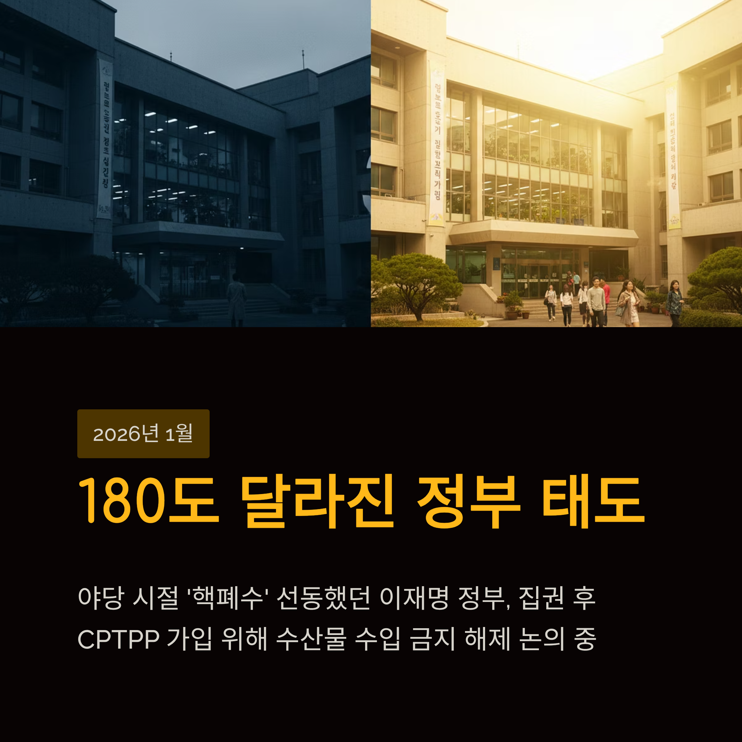 극단적 태도 변화: 과거 이재명 대통령은 야당 대표 시절 오염수 방류를 "우물에 독극물 타기", "제2의 태평양 전쟁"이라 칭하며 강력히 비난했으나, 현재는 CPTPP 가입을 위해 일본산 수산물 수입 금지 해제 가능성을 시사했습니다.