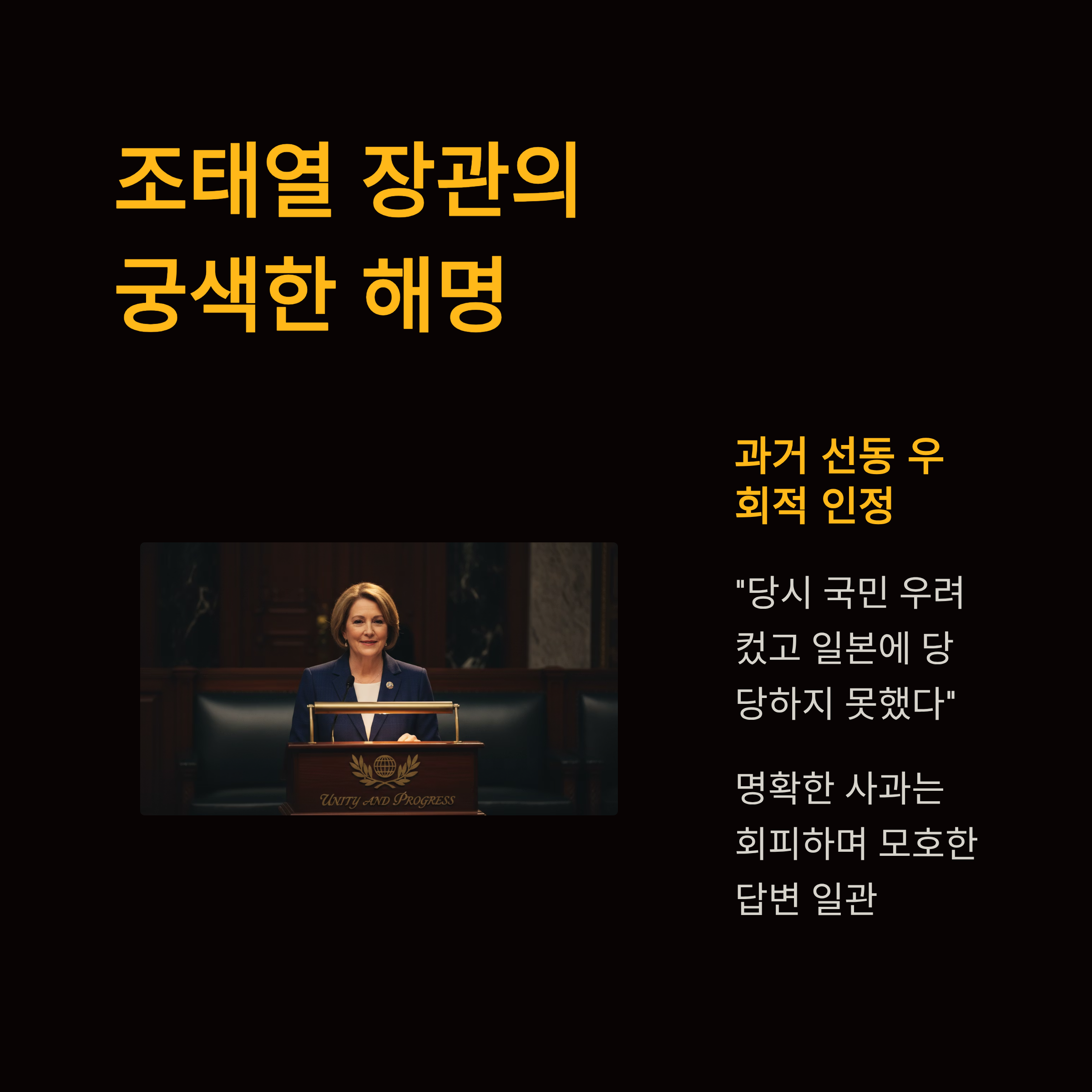 외교부 장관의 궁색한 답변: 조태열 외교부 장관(추정)은 이러한 태도 변화에 대해 "국익을 위한 미래지향적 실용 외교"라고 답하며, 과거의 선동이 과도했음을 우회적으로 인정하면서도 명확한 사과는 회피했습니다.