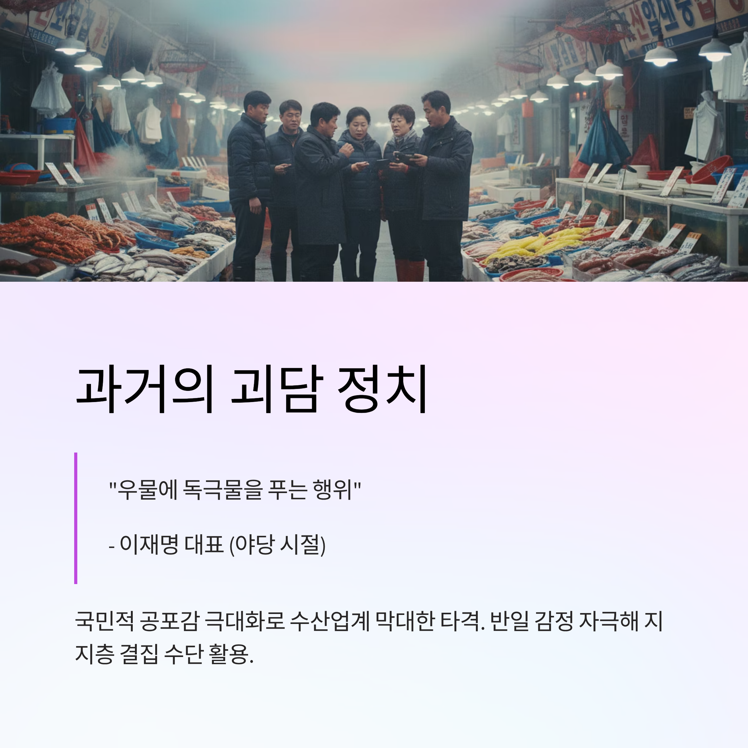 이재명 대통령은 야당 지도자 시절, 후쿠시마 오염수 방류를 "우물에 독극물을 푸는 행위"에 비유하며 국민적 공포감을 극대화했습니다. 당시 이러한 정치적 수사는 수산업계에 막대한 경제적 타격을 입혔고, 반일 감정을 자극하여 지지층을 결집하는 수단으로 활용되었습니다. 그러나 집권 후 대통령의 위치에서는 일본과의 협력이 필수적인 CPTPP 가입과 한일 관계 정상화라는 현실적 과제에 직면했습니다. 문제는 과거 자신들이 뱉어놓은 극단적인 발언들이 현재의 외교적 유연성을 발목 잡는 족쇄가 되고 있다는 점입니다. 국민들은 과학적 사실이 변하지 않았음에도 정치적 위치에 따라 "독극물"이 "협상 카드"로 변하는 상황을 목격하며 정부의 신뢰성에 의문을 제기하고 있습니다.