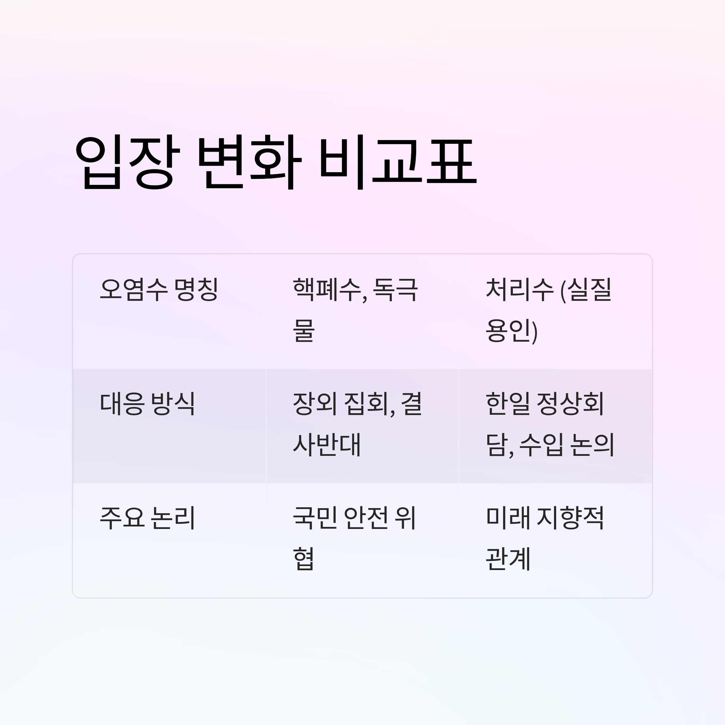| 대응 방식 | 장외 집회, 결사반대, 수입 절대 불가 | 한일 정상회담, 수입 재개 논의 (CPTPP) |
