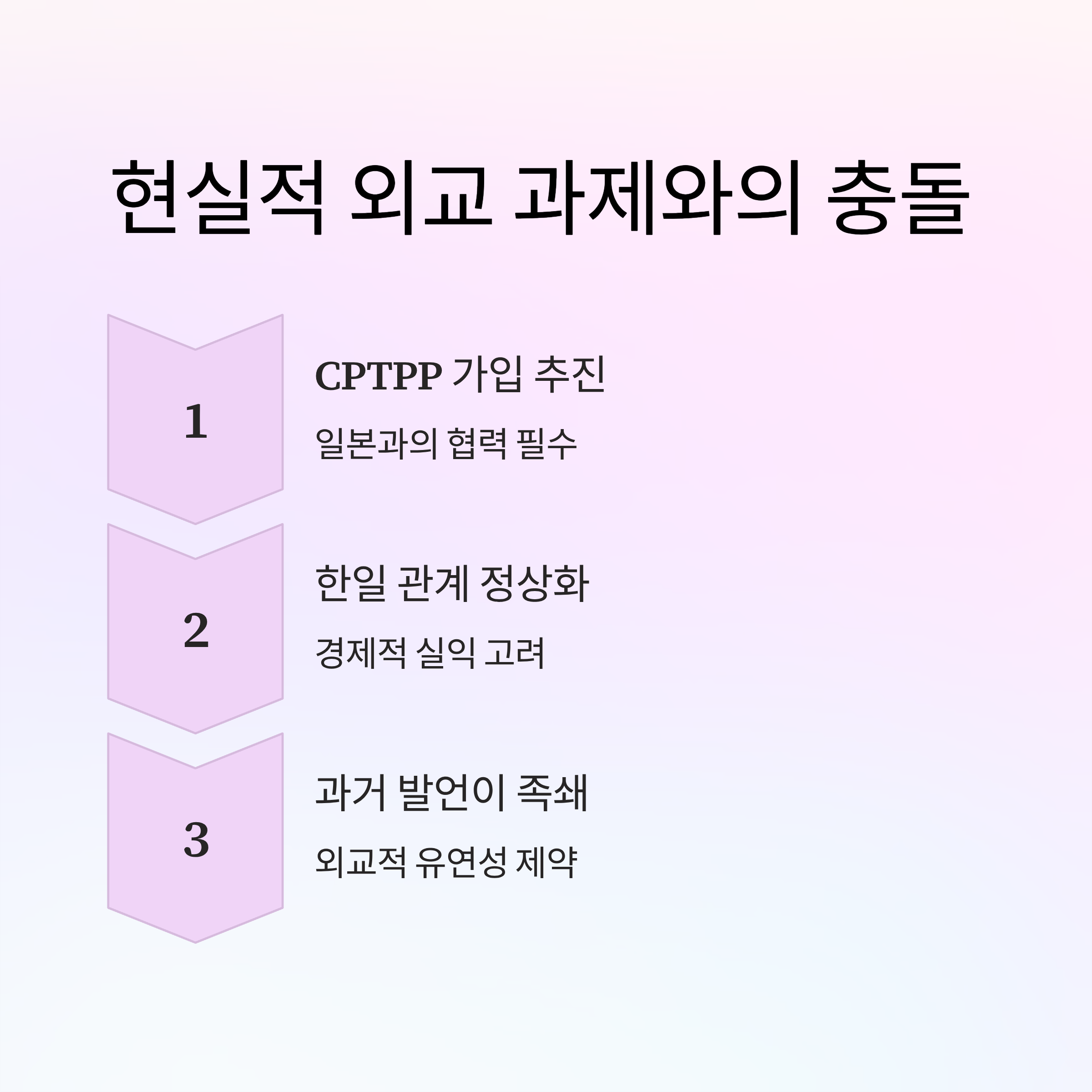 대통령 취임 후에는 CPTPP 가입을 명분으로 일본 수산물 수입 재개 가능성까지 시사하며 과거와는 다른 태도를 보입니다.