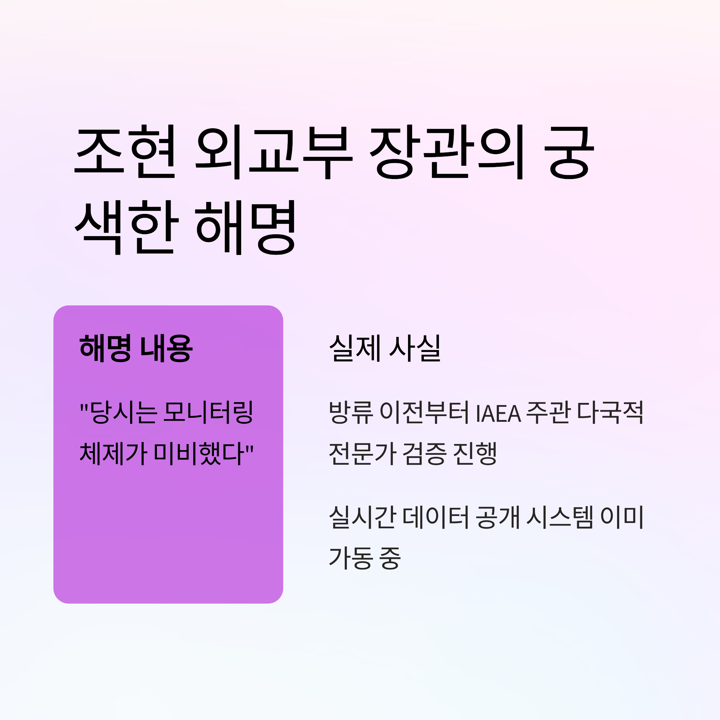 외교부는 '과거엔 모니터링 체계 미비'였다는 궁색한 해명을 내놓았지만, 방류 초기부터 국제적 검증이 이루어졌다는 점에서 설득력이 떨어집니다.
