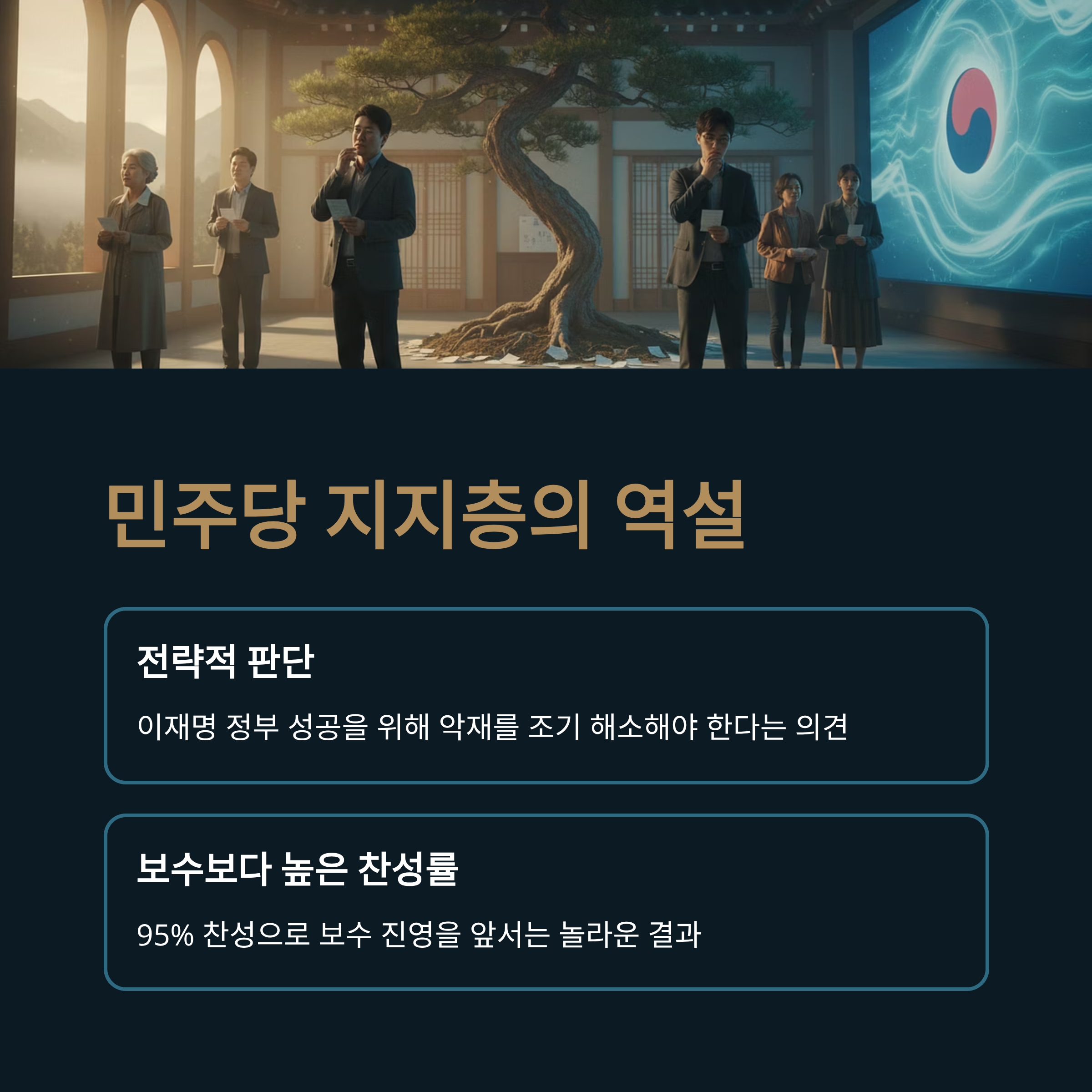 민주당 지지층의 역설: 민주당 지지층에서 특검 찬성 의견이 95%에 달하며 보수 진영보다 높게 나타났습니다. 이는 악재를 조기에 해소하려는 전략적 판단으로 해석됩니다.
