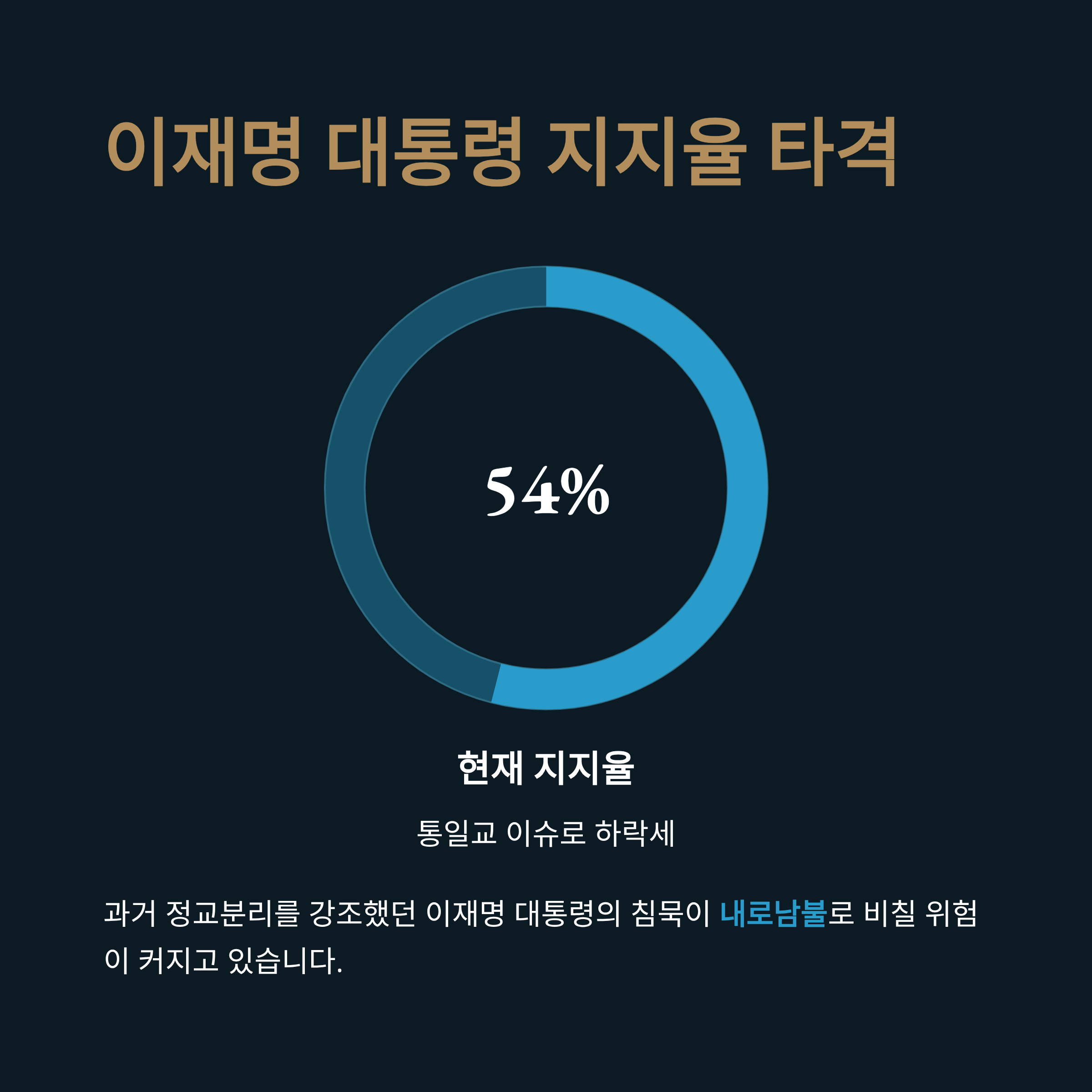 이재명 대통령 지지율 타격: 통일교 이슈가 불거지며 이재명 대통령의 지지율이 54%대로 조정받는 등 부정적 영향이 가시화되고 있습니다.
