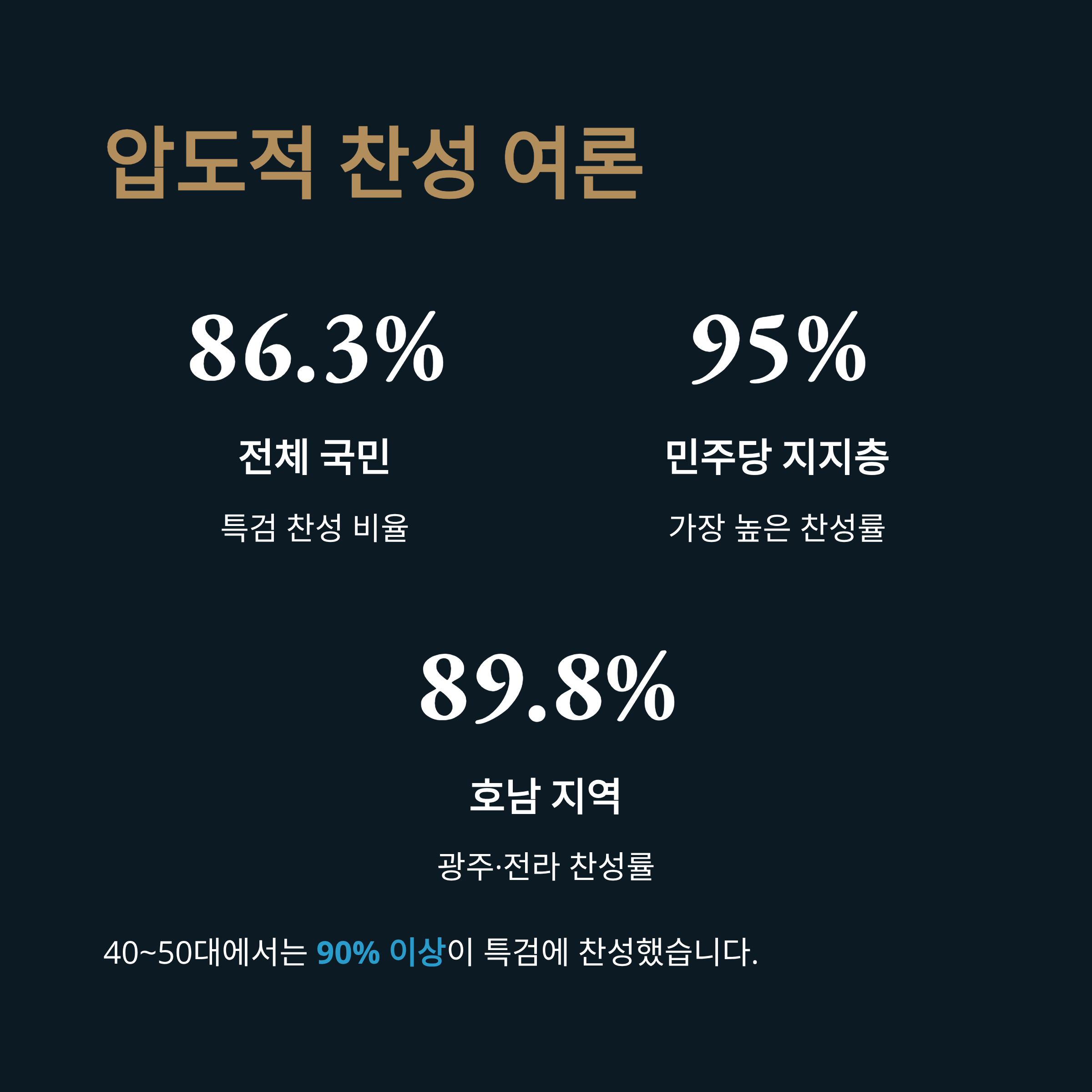 전체 응답자의 86.3%가 특검에 찬성했으며, 특히 민주당의 정치적 기반인 광주·전라 지역에서 89.8%, 40대 이상에서 90.4%라는 경이적인 찬성률이 나왔습니다.