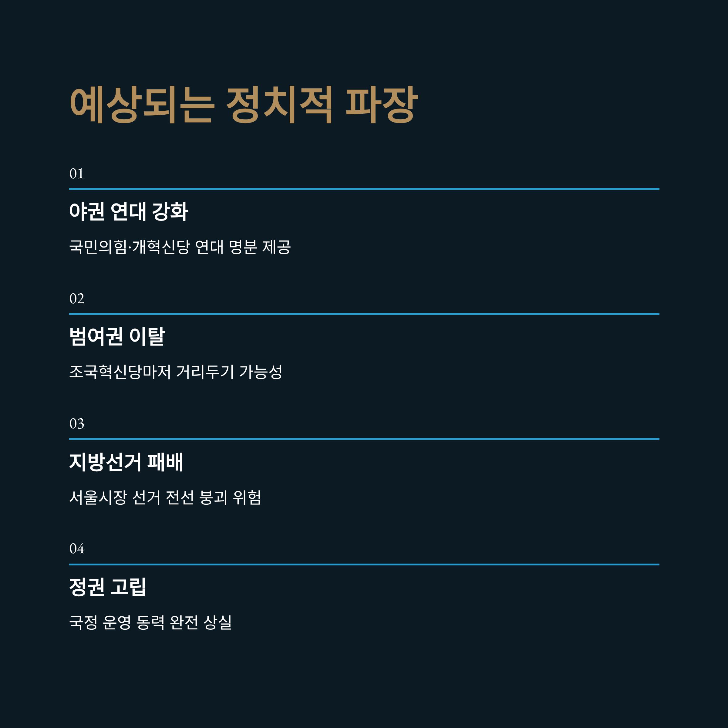 이는 개혁 동력을 상실케 하고, 야권(국민의힘, 개혁신당)의 연대를 강화하며, 조국혁신당과 같은 범여권 세력의 이탈을 초래할 수 있습니다.