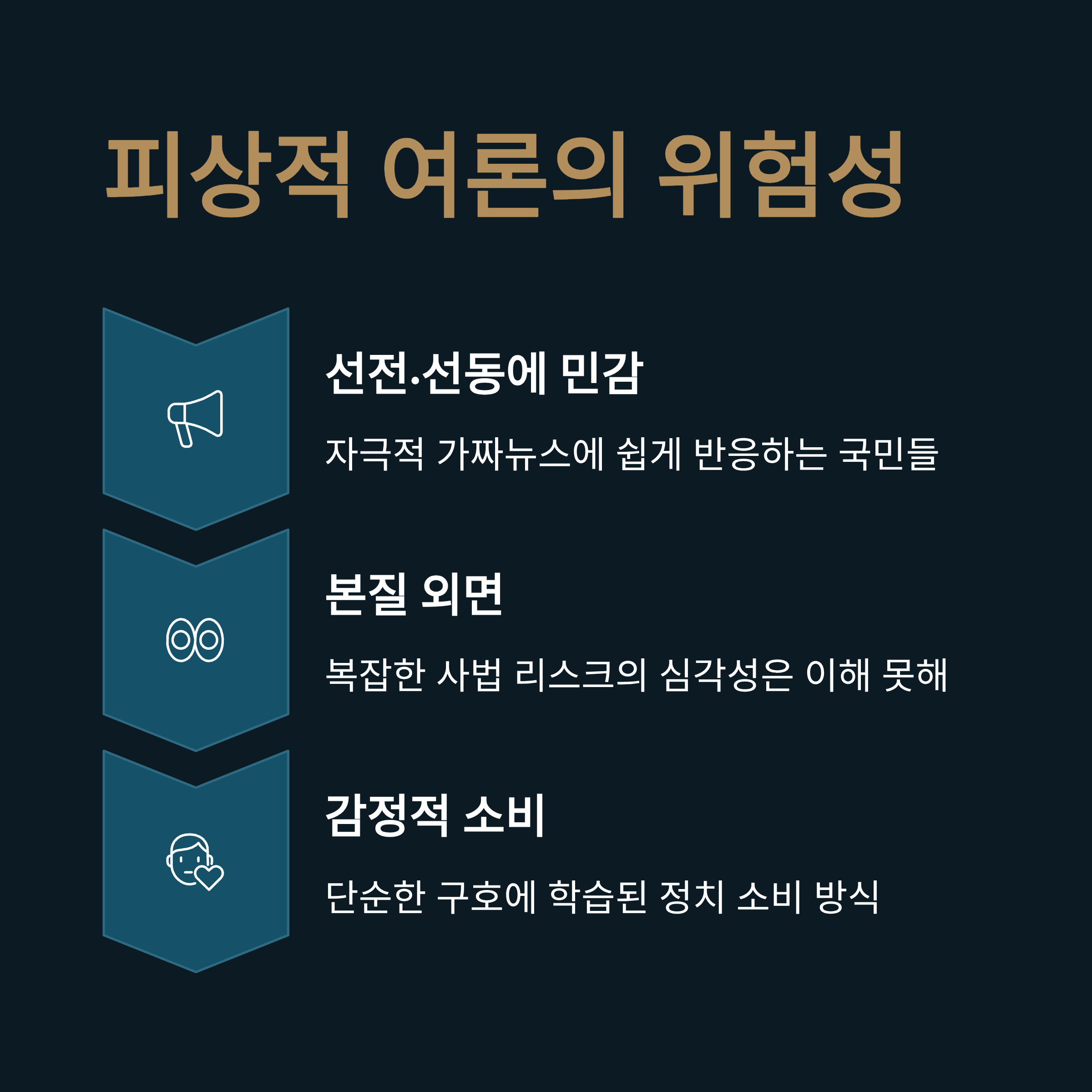 이는 국민들이 정치적 사안을 피상적으로만 소비하고 있으며, 복잡한 진실보다는 단순하고 감정적인 구호에 학습되어 있음을 보여주는 안타까운 현실입니다.