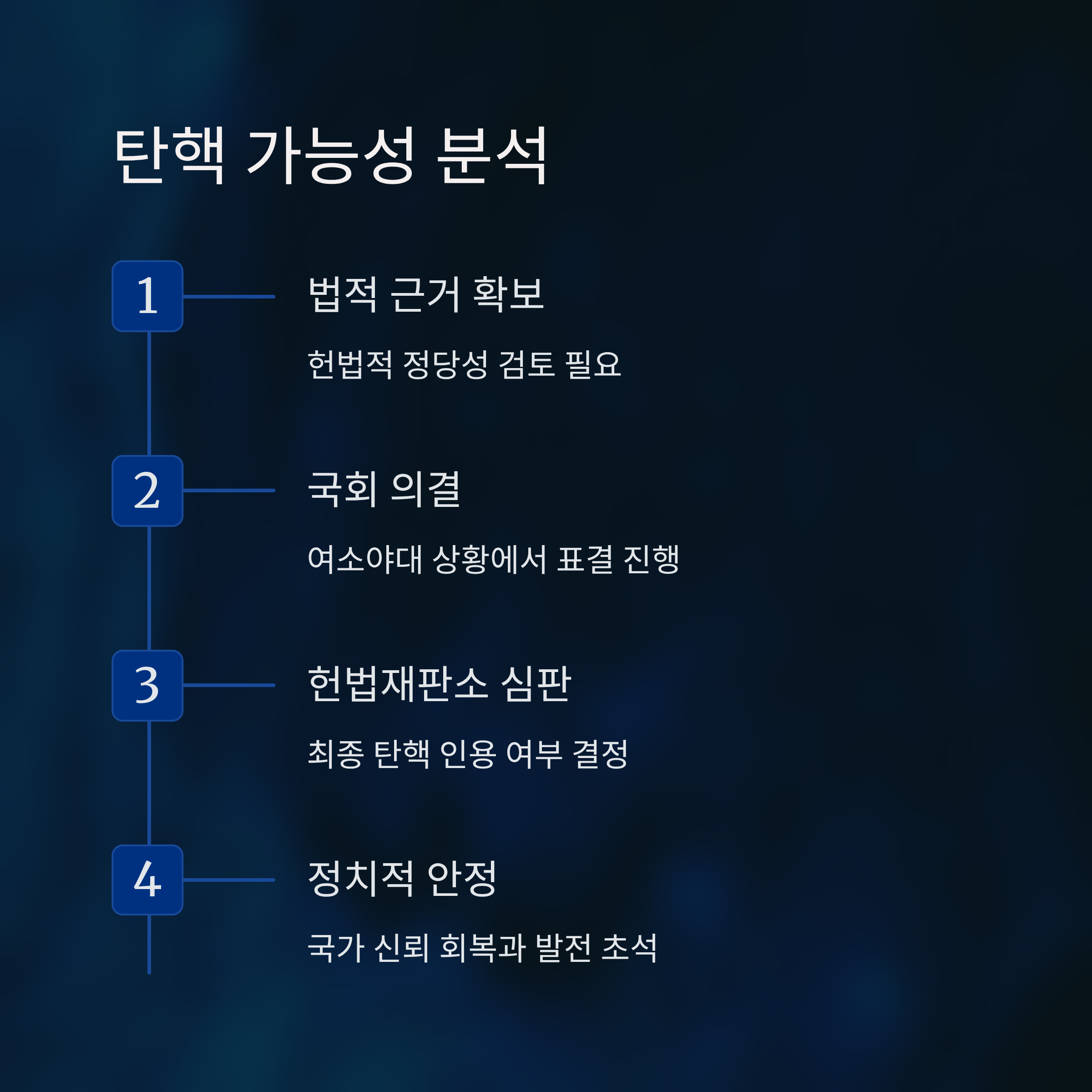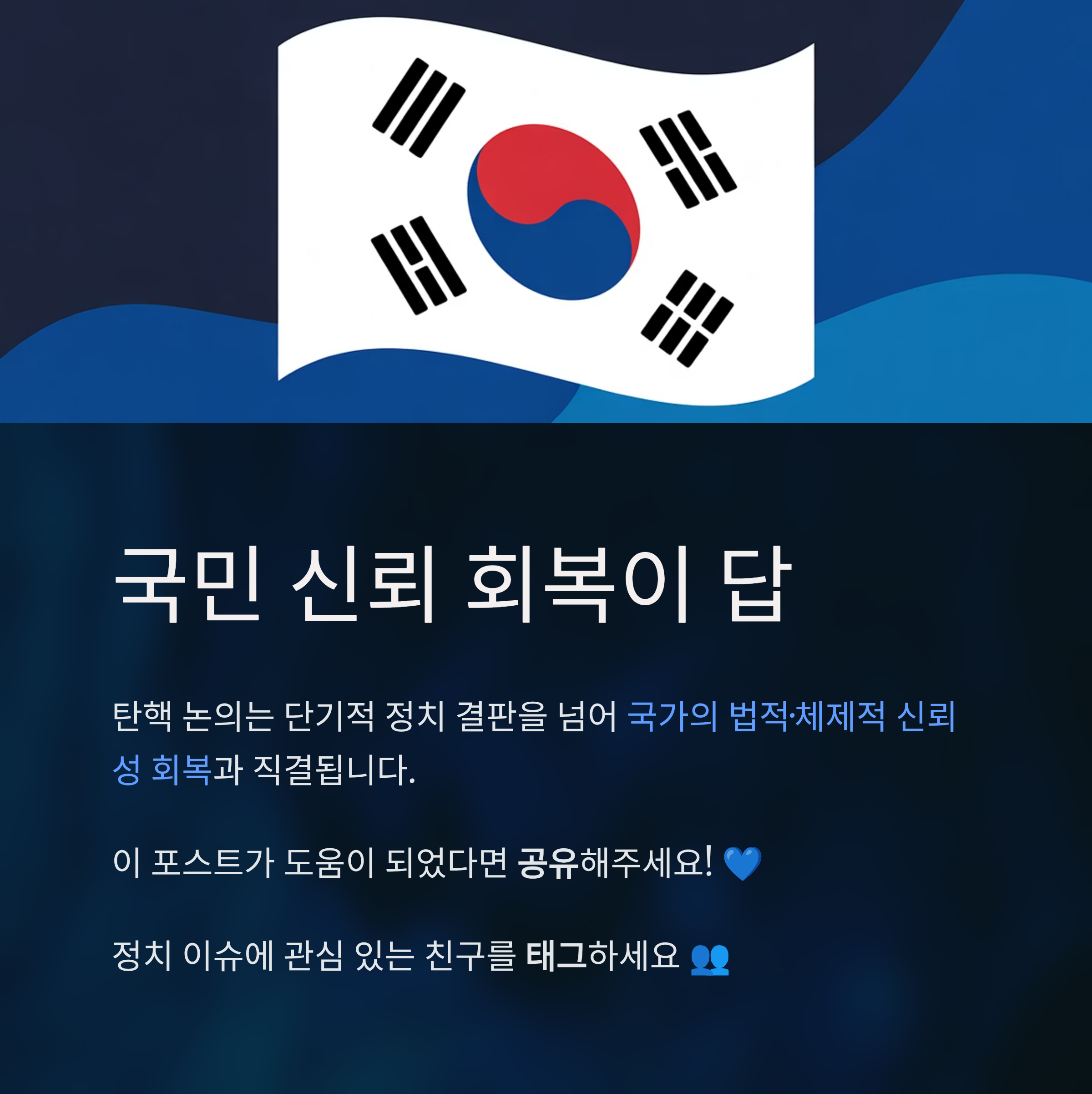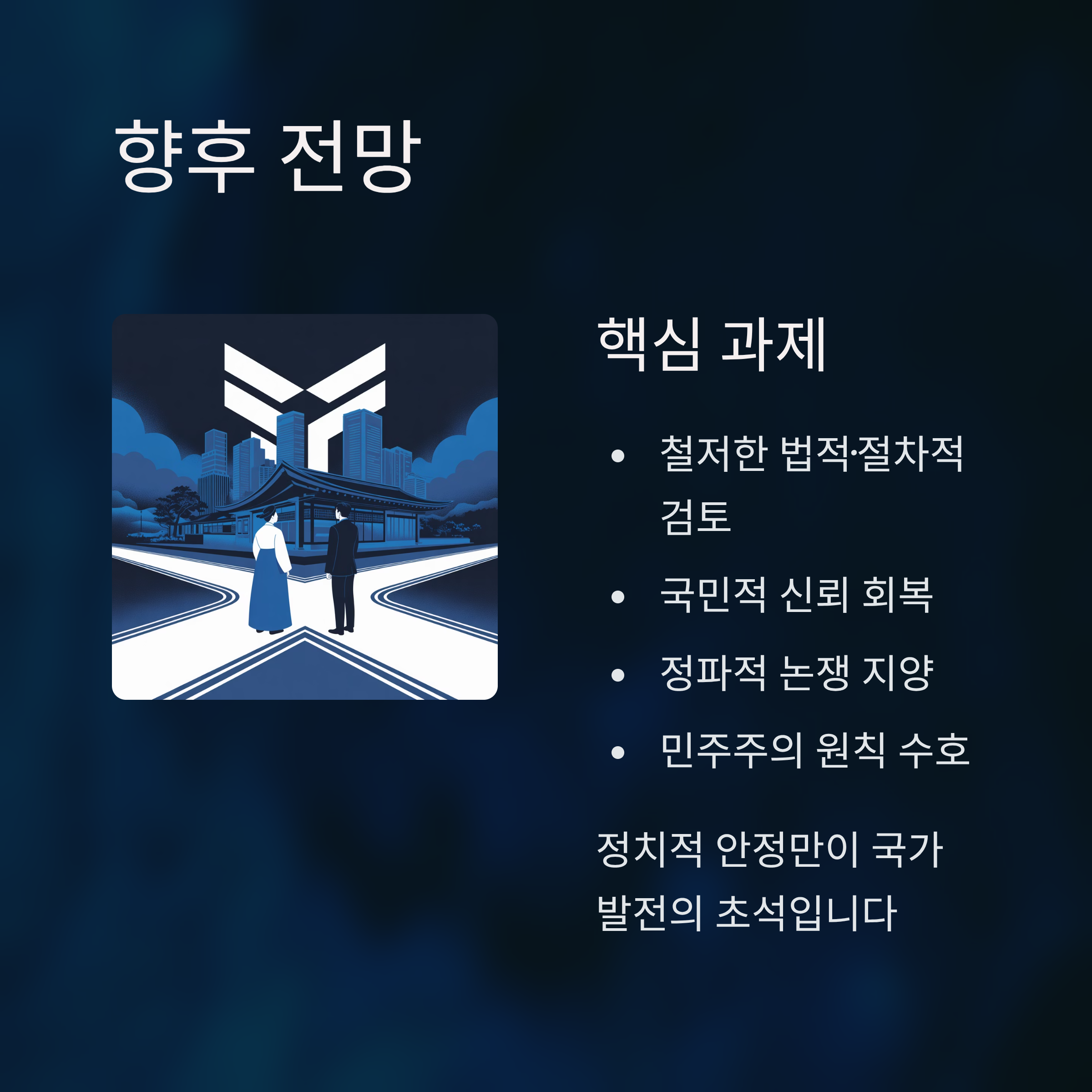 탄핵 논의는 단지 단기적 정치적 결판을 넘어, 국가의 법적, 체제적 신뢰성 회복과 직결됩니다. 본 사안이 단순히 정파적 논쟁으로 끝나지 않고, 철저한 법적, 절차적 검토를 통해 신중히 다뤄질 필요가 있습니다. 궁극적으로 국민적 신뢰 회복만이 정치적 안정과 국가적 발전의 초석이 될 것입니다.