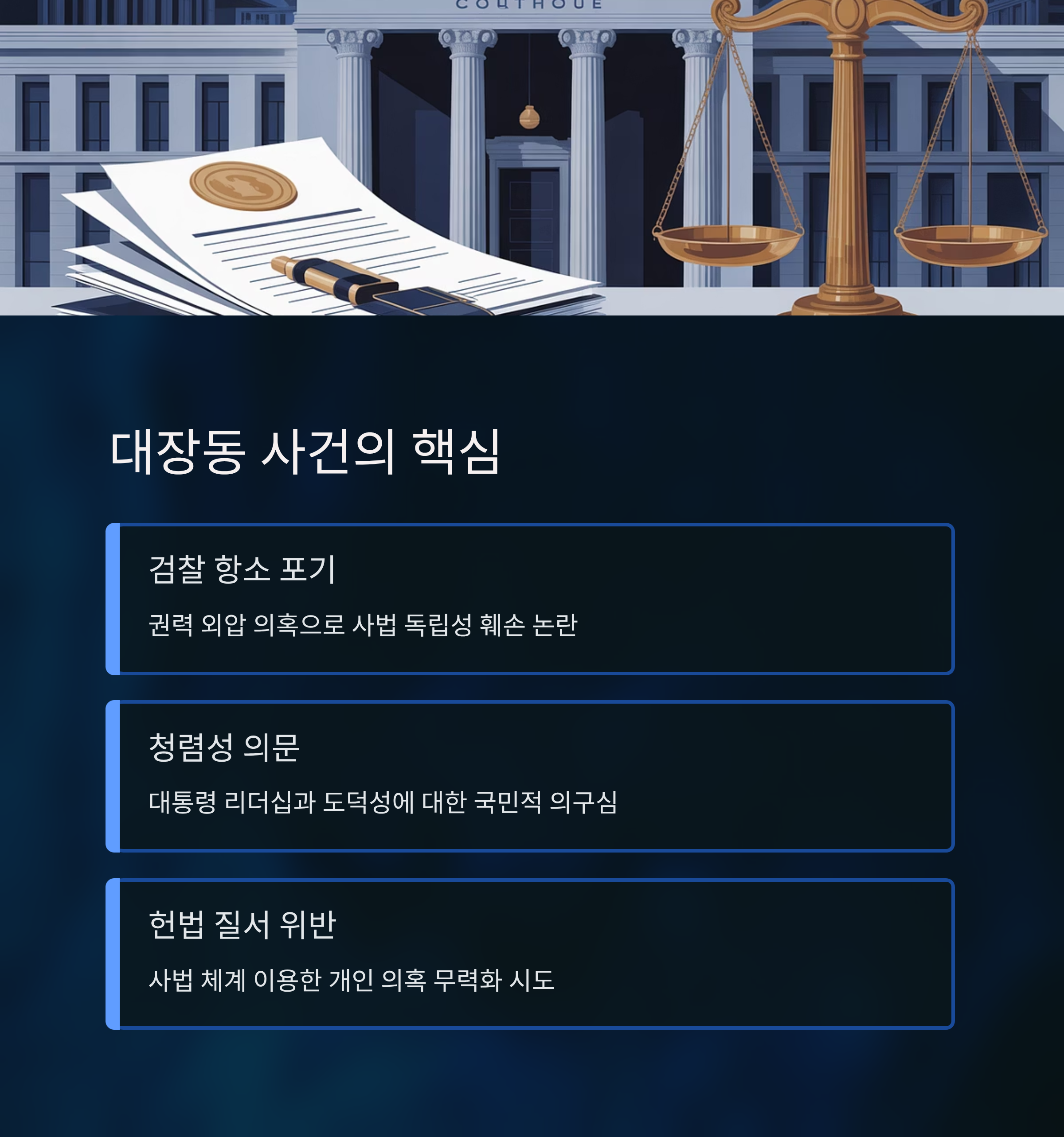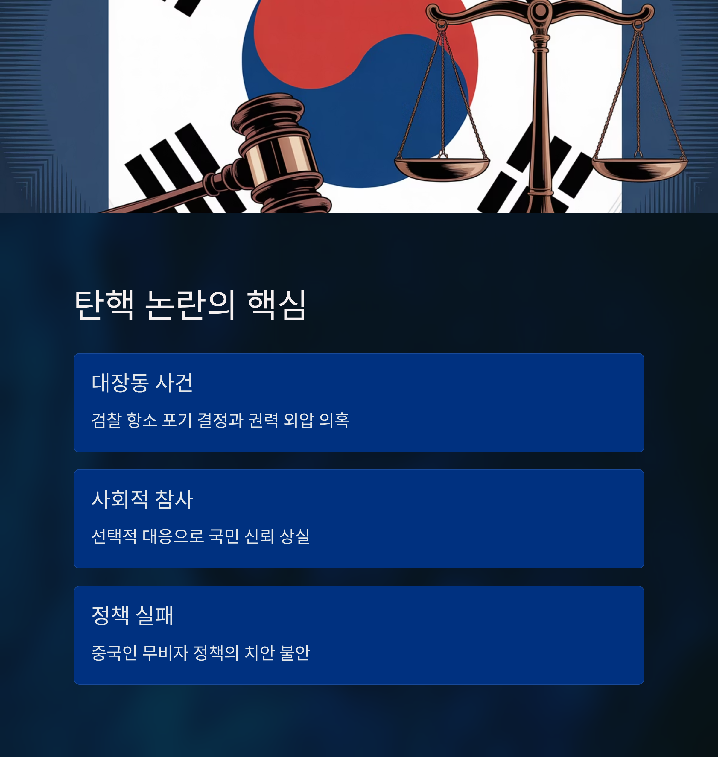 대장동 사건은 이재명 대통령의 리더십과 청렴성을 도마 위에 올린 사건 중 하나입니다. 특히 이 사건과 관련된 검찰의 항소 포기 결정은 김민수 최고위원이 언급한 탄핵 사유 중 핵심으로 자리 잡았습니다. 이는 단순한 사법적 결정이 아니라, 권력 외압이라는 의혹을 불러일으키며 민주주의 핵심 원칙인 사법 독립을 훼손했다는 평가를 받습니다.