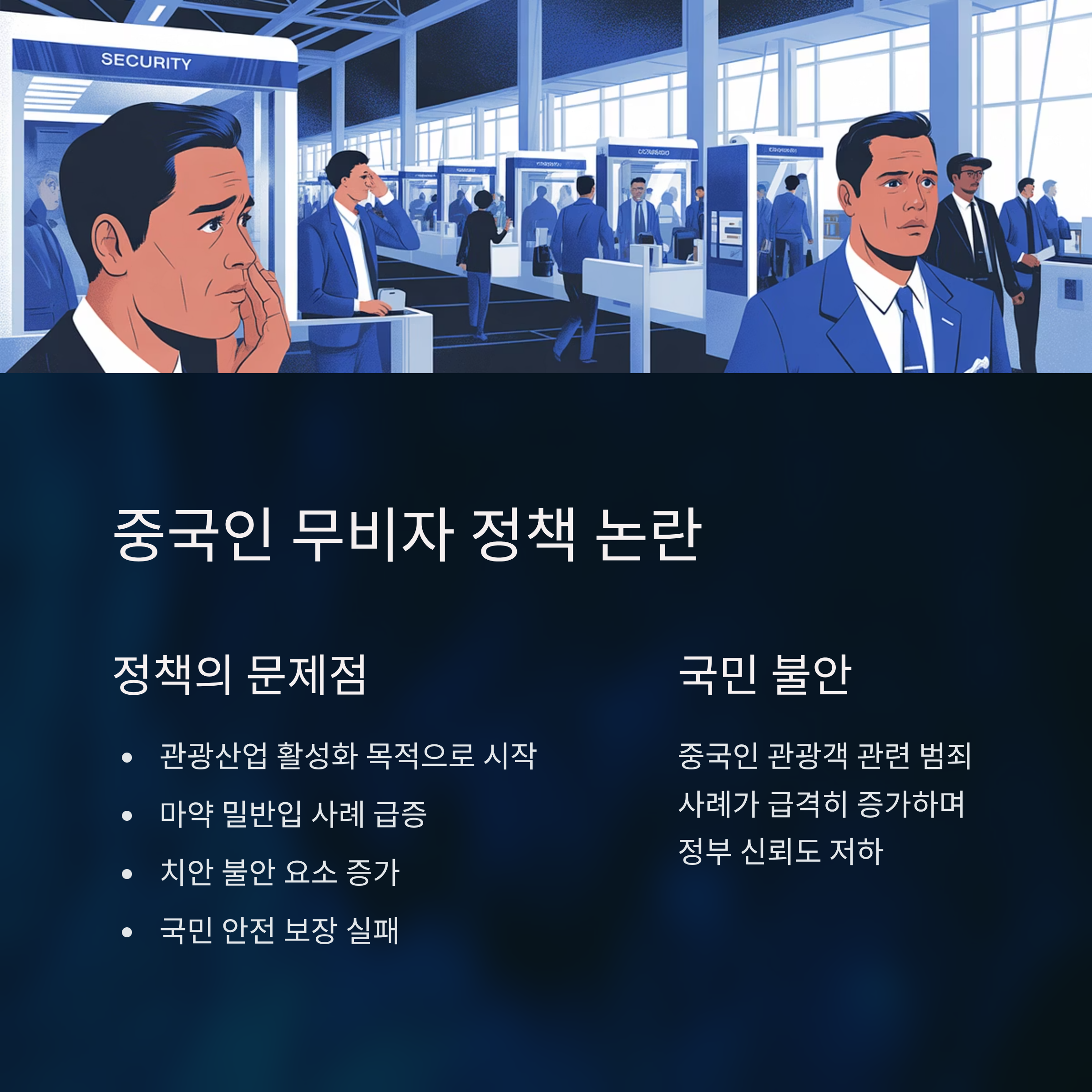중국인 무비자 입국 정책은 김민수 최고위원이 지적한 탄핵 사유 중 하나입니다. 이 정책은 관광산업 활성화를 위한 목적에서 추진되었으나, 실제로는 마약 밀반입 문제와 같은 치안 불안 요소를 증가시켰다는 비판을 받고 있습니다. 이는 단순한 정책 시행 실패를 넘어선 국가적 위기 대응 부재로 평가되며, 국민 안전을 보장해야 할 정부의 신뢰도를 크게 저하시키는 결과를 초래했습니다.