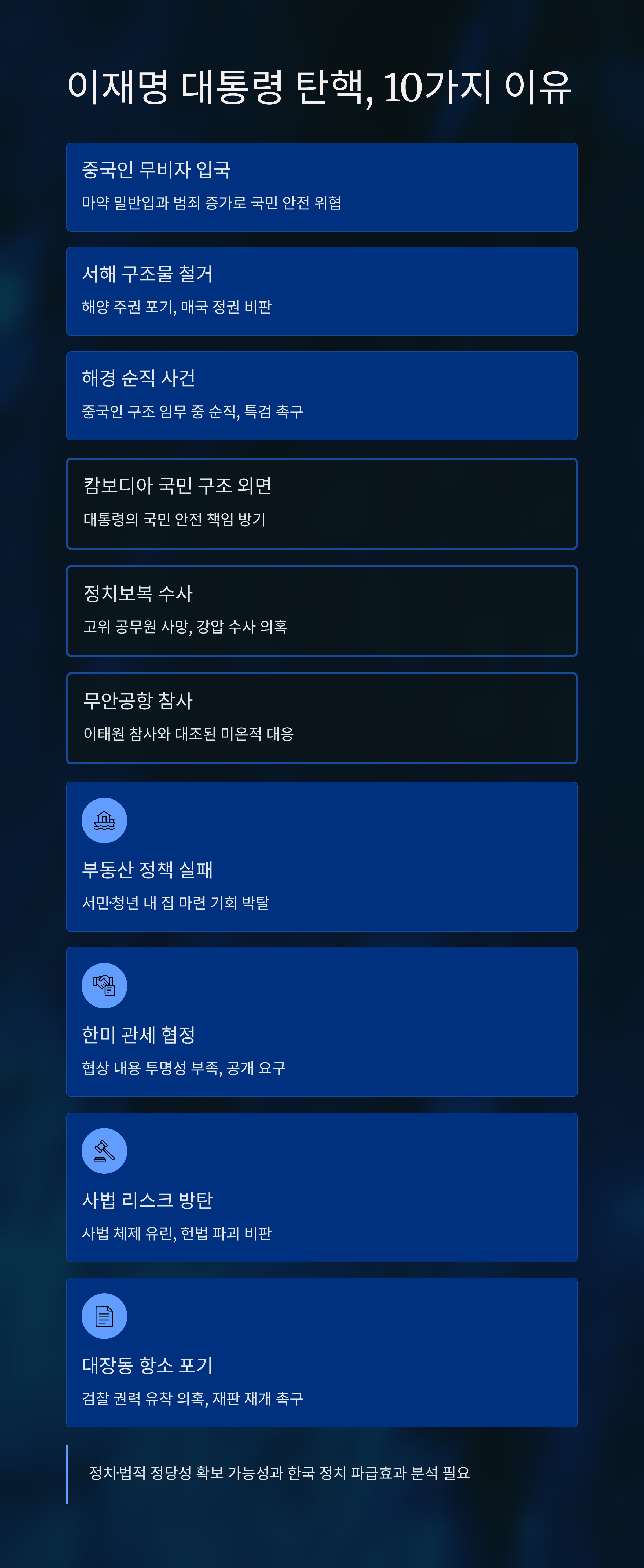 특히 국제적 이슈인 캄보디아 국민 구조 외면 사례는 외교적 신뢰까지 훼손시켰다는 비판을 받으며, 이 또한 탄핵 논리를 강화하는 중요한 논거 중 하나입니다. 이러한 사건들은 정부의 긴급대응체계가 현실적이지 않거나 의도적으로 왜곡되고 있다는 오해를 낳고 있습니다.