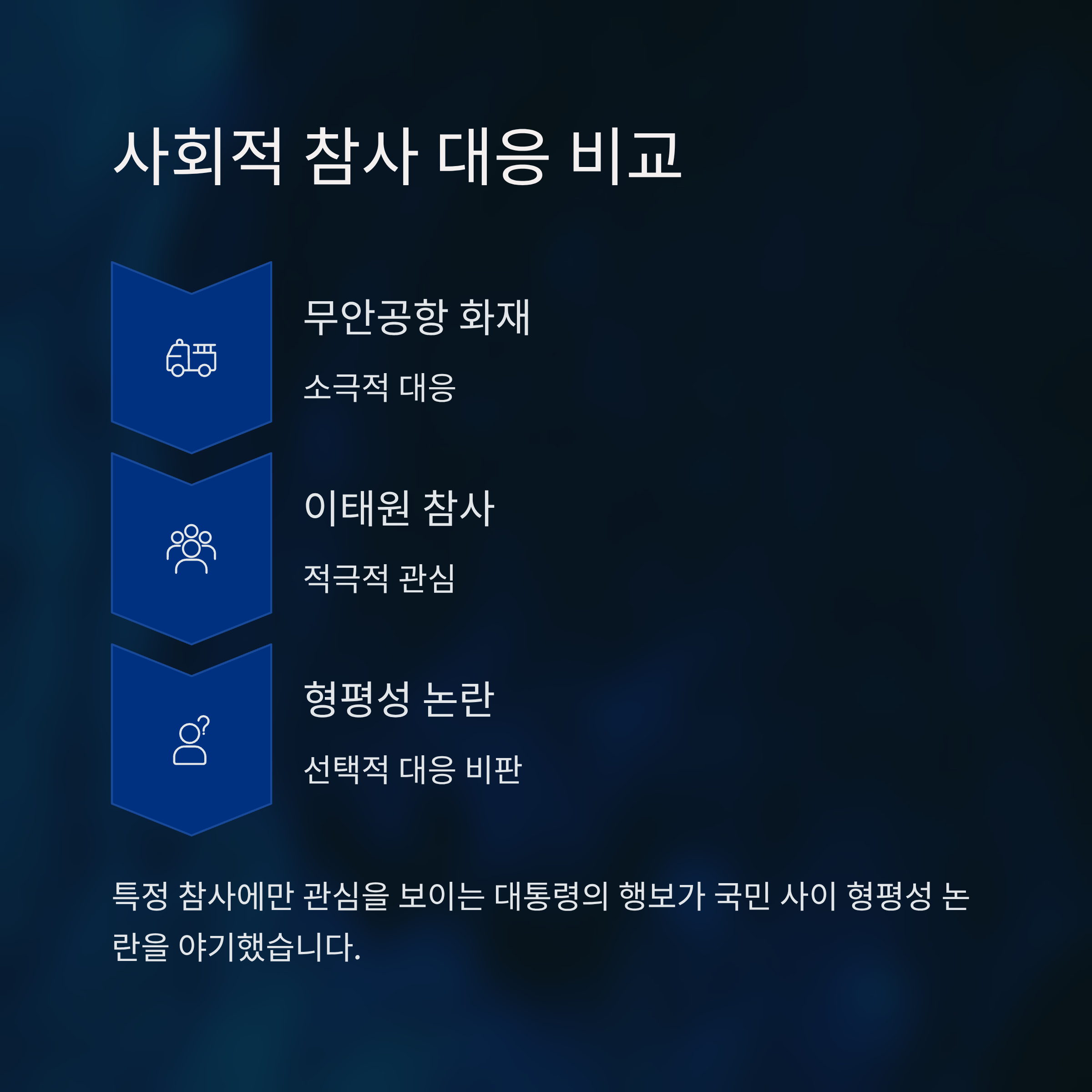 김민수 최고위원은 사회적 참사가 발생했을 때 이재명 대통령이 이를 외면하거나 적극적으로 대처하지 않은 점을 들며 국민적 리더십 부재를 지적했습니다. 대표적인 예로 무안공항 화재 사건과 이태원 참사의 상반된 대응이 언급되었습니다. 이와 같이 특정 참사에만 선택적 관심을 보이는 듯한 대통령의 행보는 국민 사이에서 형평성 논란을 야기하였으며, 이는 김 최고위원이 주장하는 도덕적 리더십 상실과 맞물려 탄핵 사유로 연결됩니다.