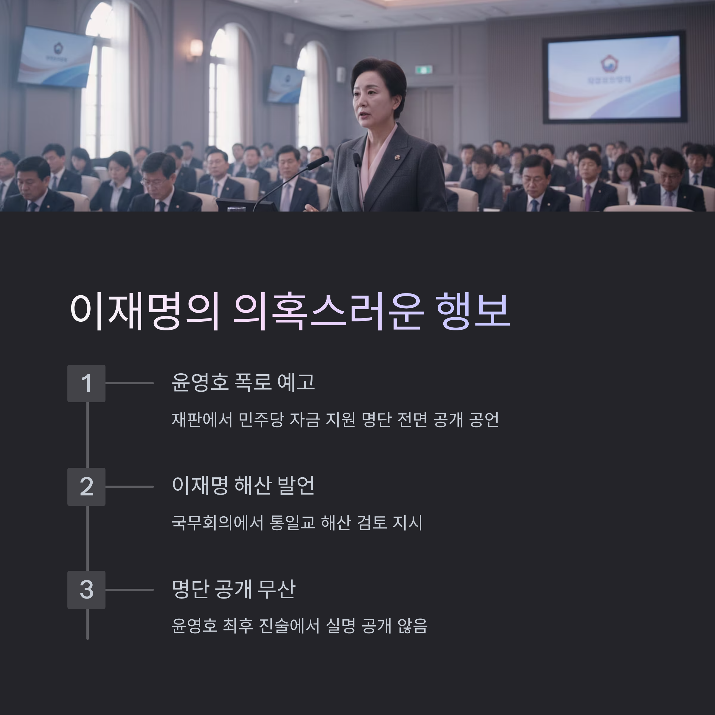 | A. 통일교 핵심 인사가 민주당 공식 당직에 임명된 점, 그리고 통일교 측 인사가 법정에서 자금 지원 명단 공개를 예고하자 이 대통령이 '통일교 해산' 발언으로 공개적인 압박을 가했다는 의혹 때문입니다. |