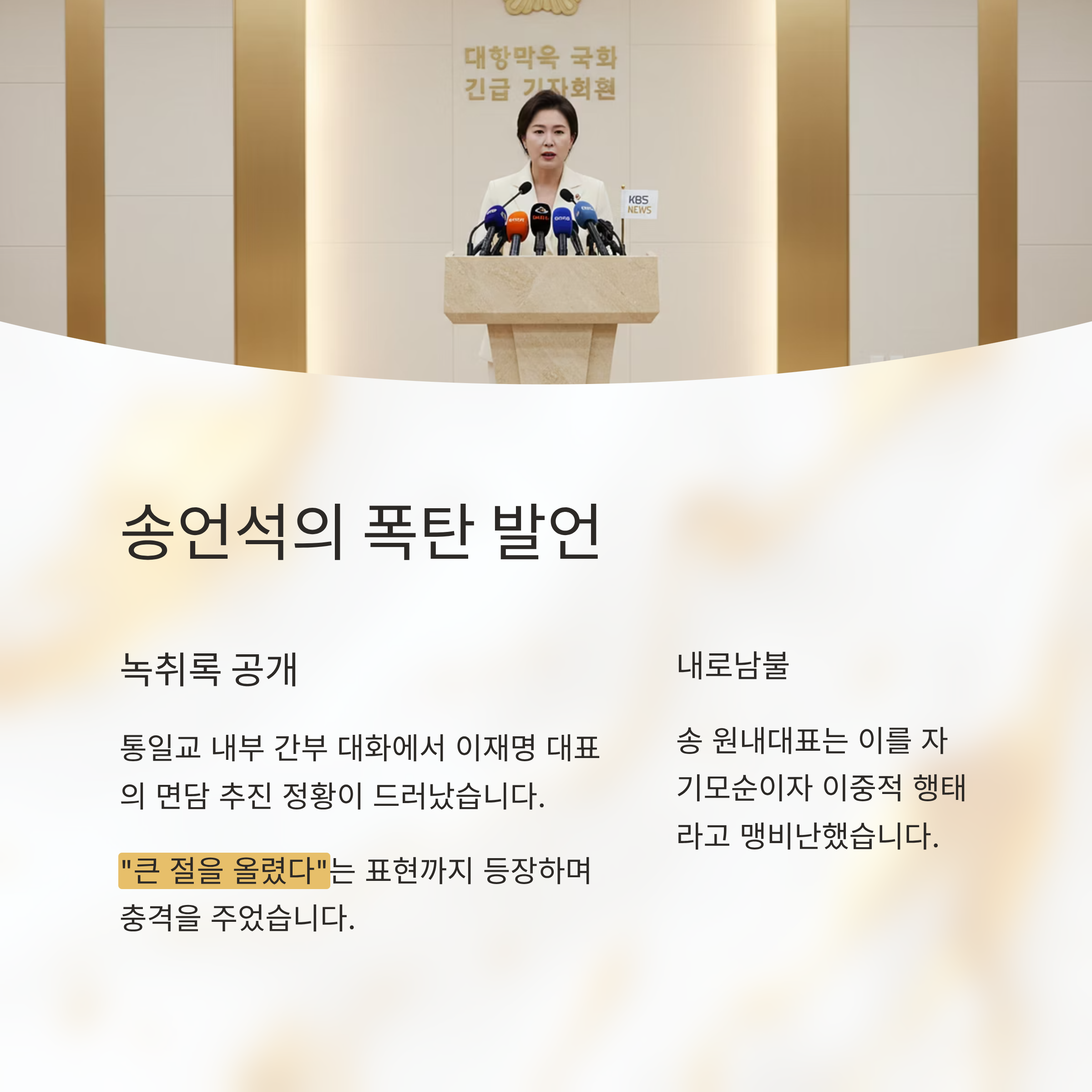 송 원내대표는 이를 근거로 이재명 대표가 통일교 해산을 주장하는 것은 자기모순이자 이중적 행태라고 맹비난하며, 정치적 공세를 최고조로 끌어올렸습니다.