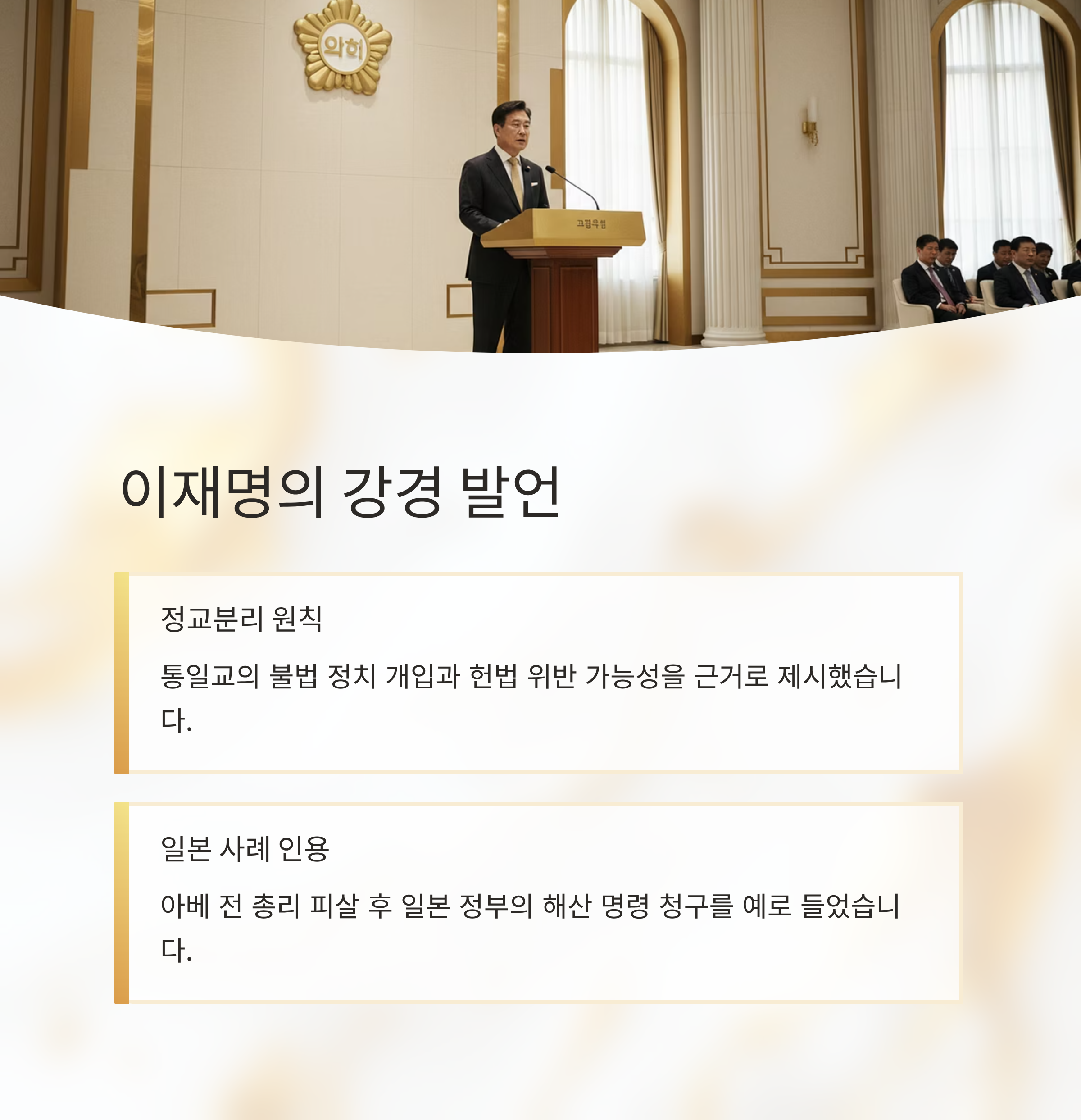 이재명 대표는 국무회의에서 통일교가 정치에 불법적으로 개입하고 헌법의 정교분리 원칙을 위반했다는 점을 정면으로 문제 삼았습니다.