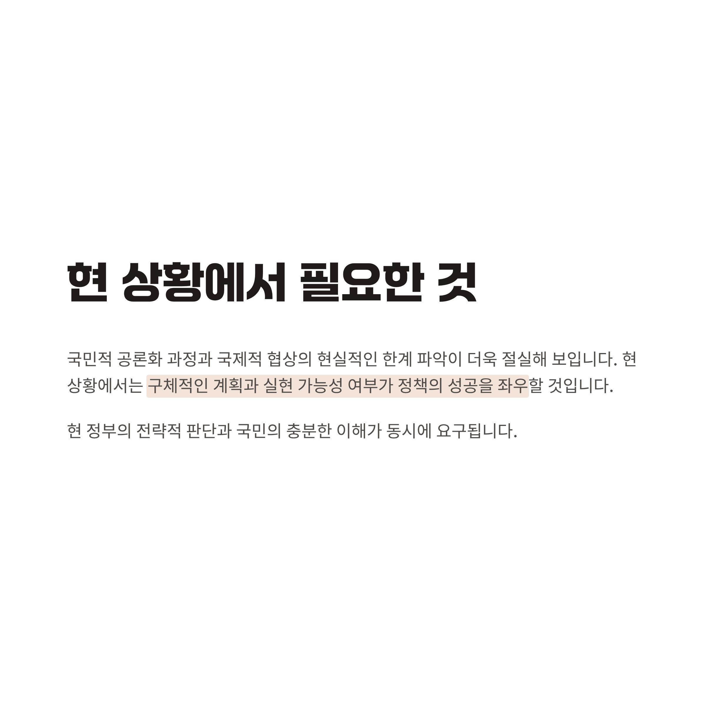 정치적으로 볼 때, 협상은 이재명 대통령에게 자주 국방을 강조할 기회를 제공했지만, 발표 이후의 신뢰성과 실행력 부족은 오히려 부정적인 반응을 초래하고 있다. 트럼프 전 대통령의 경제 이익 우선 기조 속에서 한국이 기계적 동맹 관계로만 보인다면, 정책에 대한 국내외 신뢰도는 하락세를 면치 못할 것이다. 따라서 단순히 대국민 홍보 차원을 넘어선 실질적 성과로 연결되지 않는다면, 현 정부의 리더십에도 균열을 가져올 가능성이 있다.