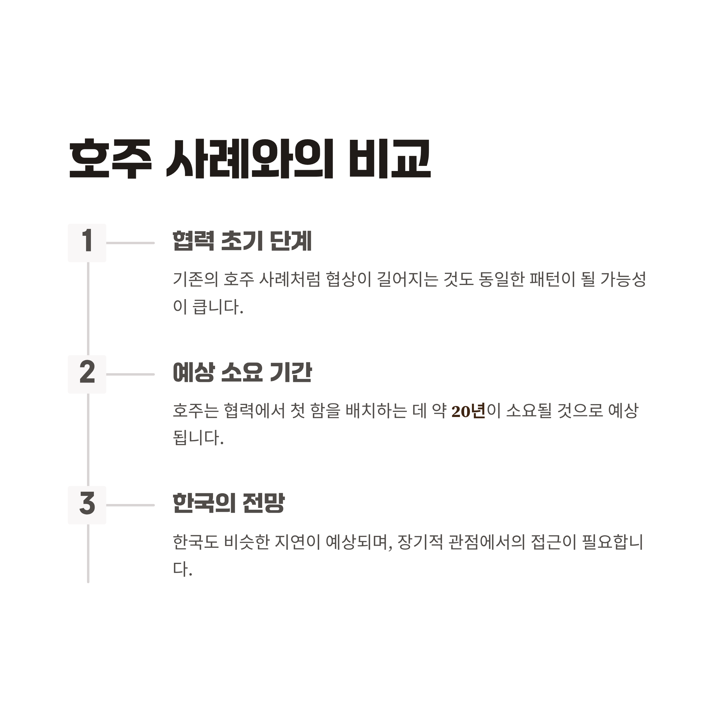 | A. 호주 사례는 협력에서 첫 함을 배치하는 데 약 20년이 소요될 것으로 보고 있어, 한국도 비슷한 지연이 예상됩니다. |