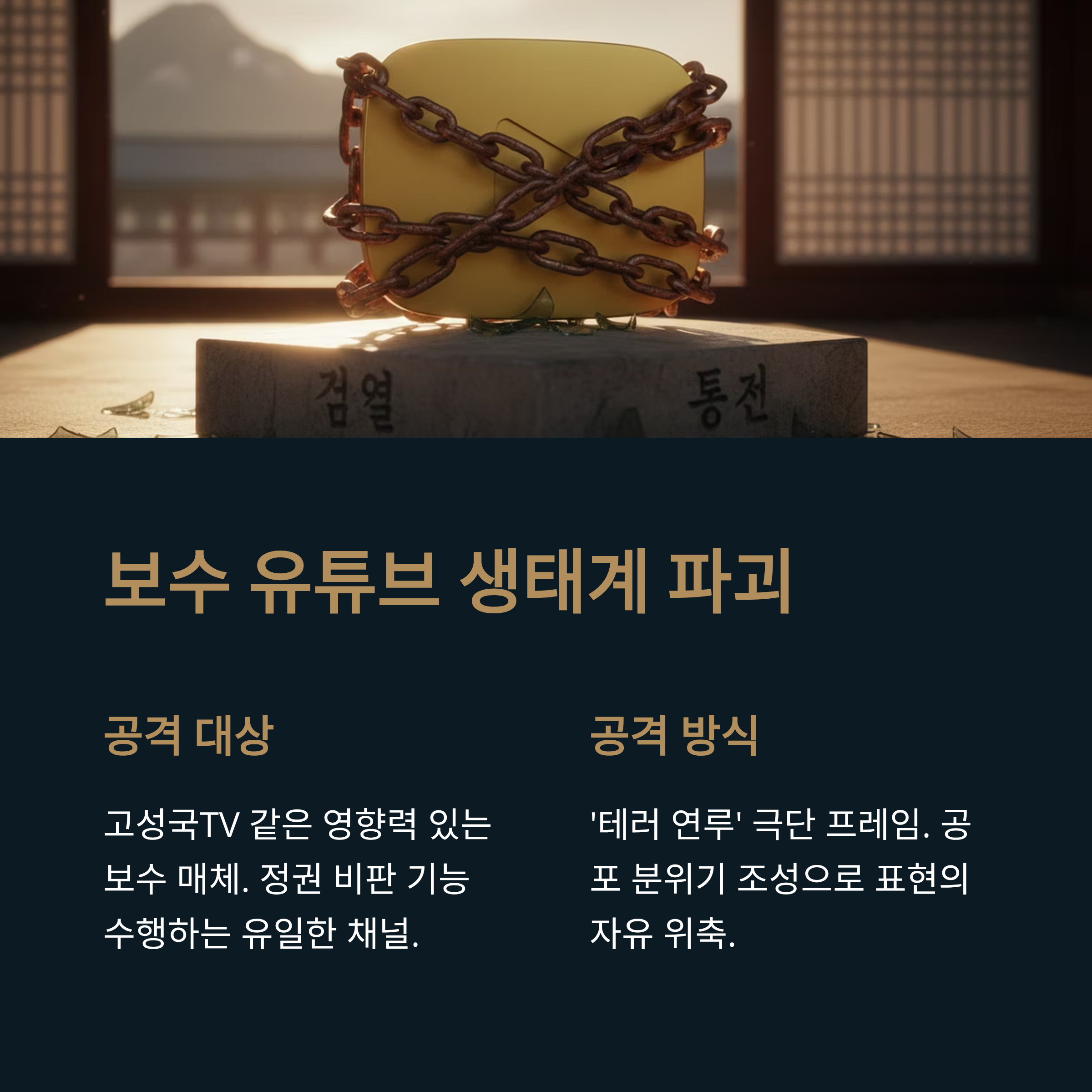 고성국 TV는 보수 진영에서 상당한 영향력을 가진 매체입니다. 2년 전 이미 종결된 사건을 빌미로 고성국 대표를 수사 선상에 올린 것은, 단순히 개인에 대한 수사를 넘어 우파 스피커들의 입을 막으려는 신호탄으로 보입니다. 민주노총 산하 언론노조가 레거시 미디어를 장악한 상황에서, 유일하게 정권 비판 기능을 수행하는 유튜브 채널들까지 '테러 연루'라는 극단적인 프레임을 씌워 무력화하려는 것입니다. 이는 비판 언론에 재갈을 물리고 공포 분위기를 조성하여 표현의 자유를 위축시키려는 전형적인 독재적 행태라는 비판을 피하기 어렵습니다.