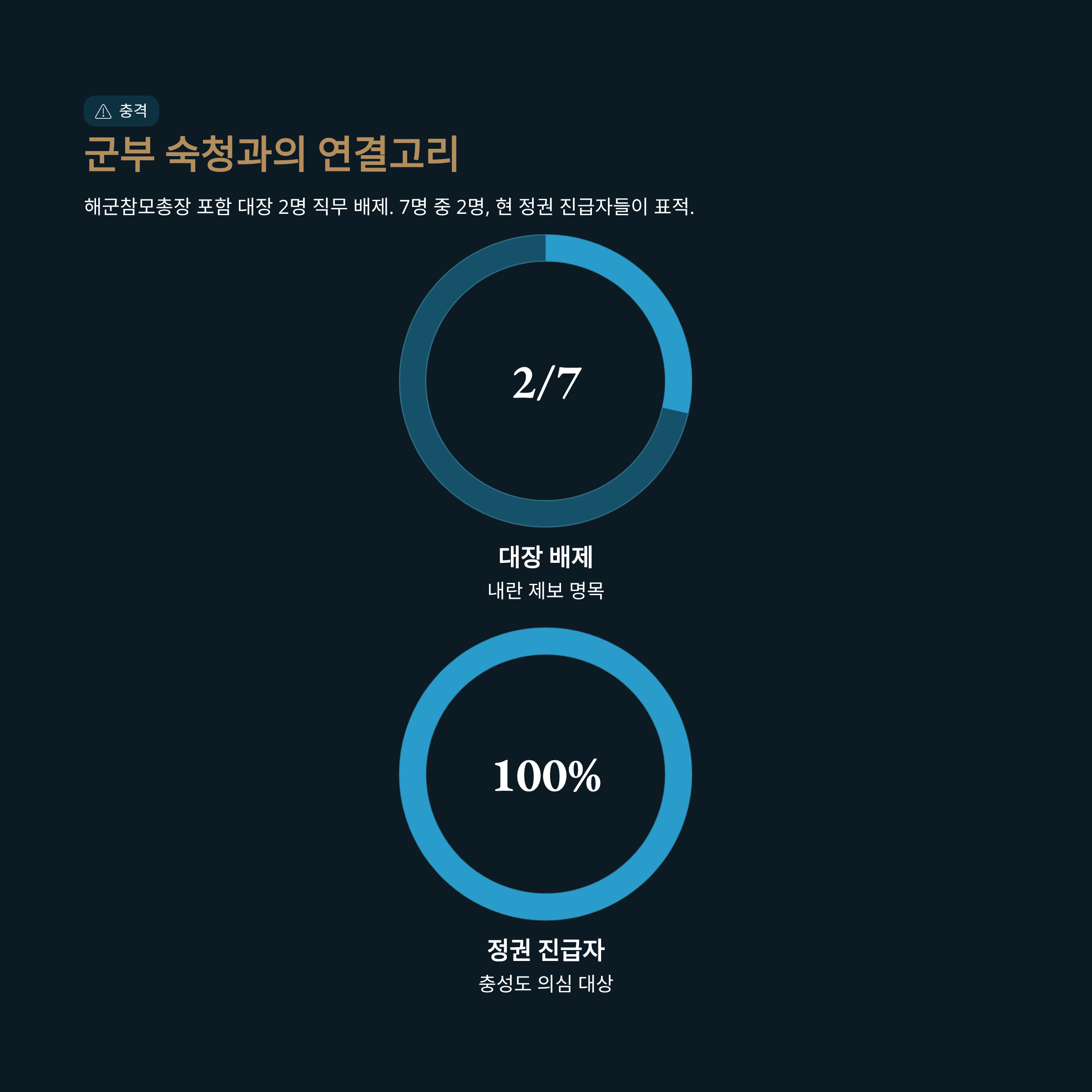 이번 사건 재수사는 단독 사안이 아니라 군 내부 숙청 작업과 맞물려 돌아가고 있다는 점에서 심각성이 큽니다. 분석에 따르면, 최근 해군참모총장을 비롯한 4성 장군(대장) 2명이 직무 배제되었습니다. 대한민국에 단 7명뿐인 대장 중 2명을, 그것도 현 정권에서 진급시킨 인물들을 '내란 관련 제보'라는 명목으로 배제한 것은 군에 대한 장악력을 높이려는 의도로 보입니다. 과거 피습 사건을 다시 꺼내 피해자 코스프레를 강화하고, 동시에 군 내부의 잠재적 반발 세력을 제거함으로써 정권의 동력을 확보하려는 고도의 정치적 계산이 깔려 있다는 분석이 지배적입니다.