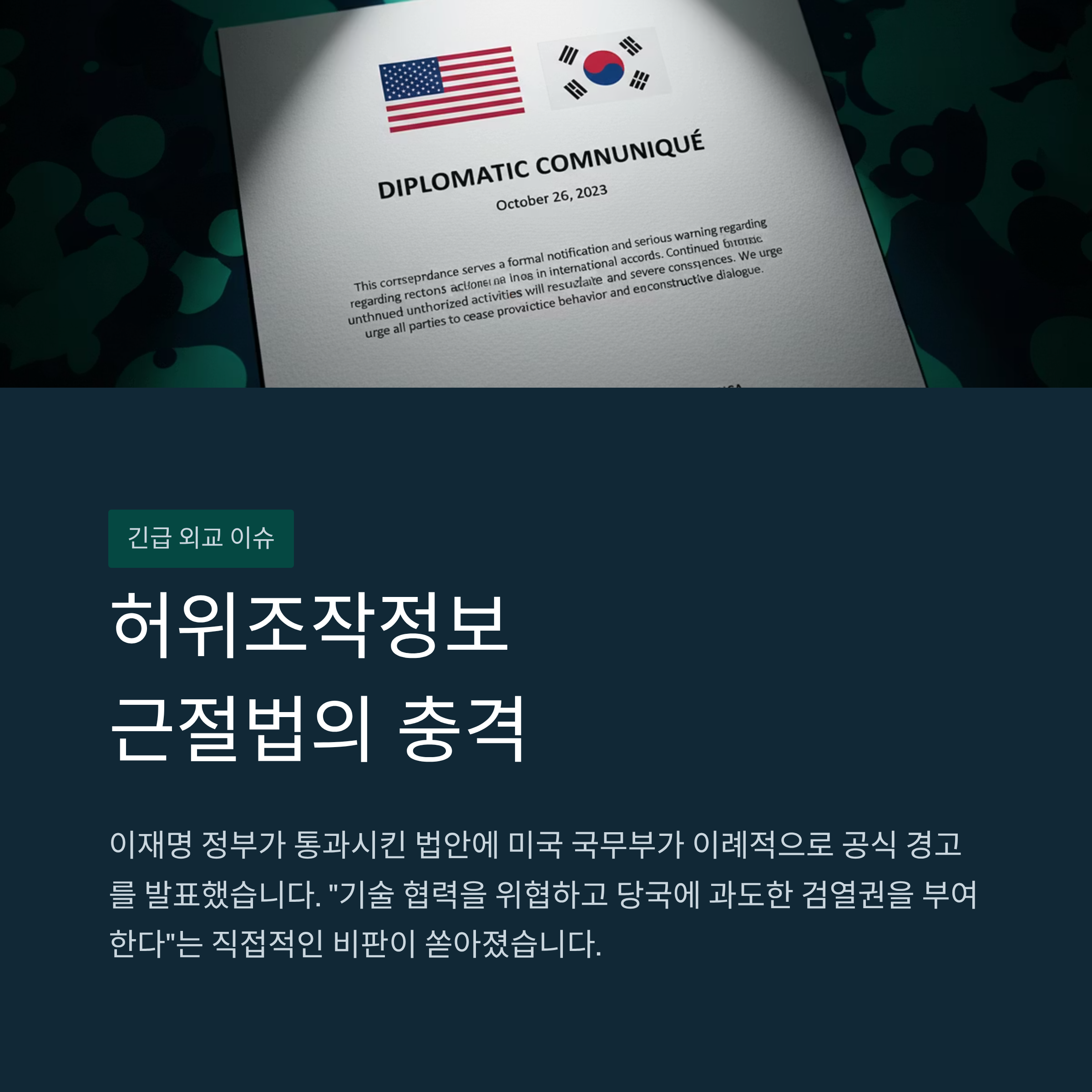 한미 외교 긴장 고조: 이재명 정부가 통과시킨 '허위 조작 정보 근절법'을 두고 미국이 표현의 자유 억압, 미국 기업 이익 침해, 한미 합의 위반 가능성을 지적하며 공식적인 우려를 표명했습니다. 이는 법안 철회 또는 수정을 압박하는 강력한 경고로 해석됩니다.