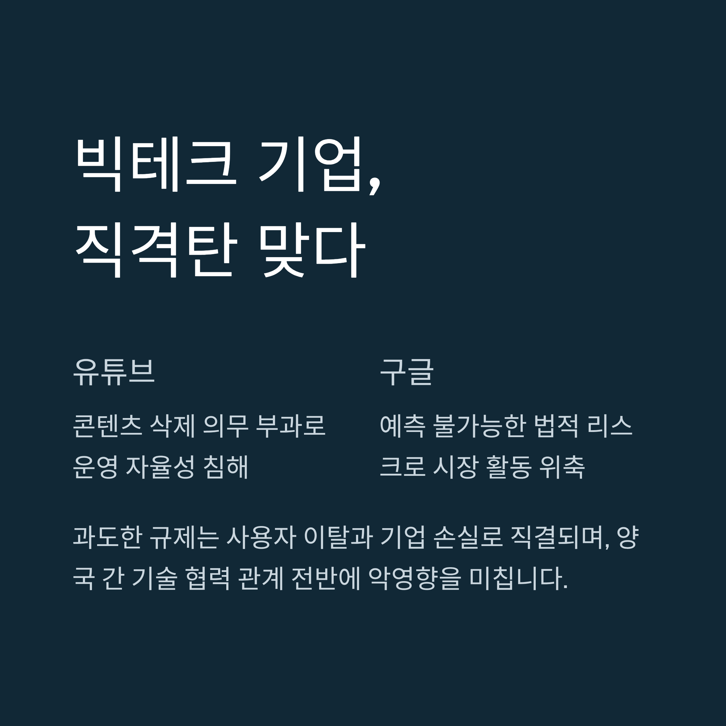 미국의 비판에는 자국 기업의 이익을 보호하려는 현실적인 이유 또한 크게 작용하고 있습니다. '허위 조작 정보 근절법'의 직접적인 규제 대상은 유튜브, 구글, X(구 트위터)와 같은 글로벌 플랫폼이며, 이들은 대부분 미국에 본사를 둔 빅테크 기업입니다. 해당 법안이 시행될 경우, 이들 기업은 한국 정부의 자의적 판단에 따라 특정 콘텐츠를 삭제하거나 제재해야 하는 의무를 지게 됩니다. 이는 플랫폼 운영의 자율성을 심각하게 침해하며, 예측 불가능한 법적 리스크를 야기하여 한국 시장에서의 기업 활동을 크게 위축시킬 수 있습니다.