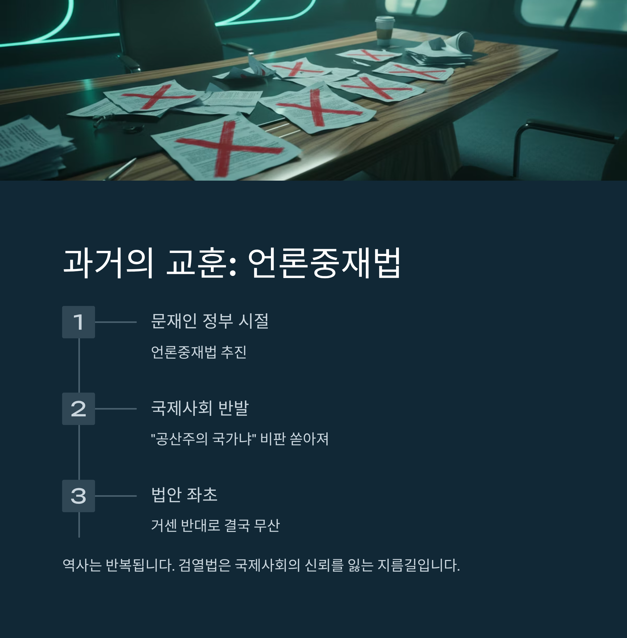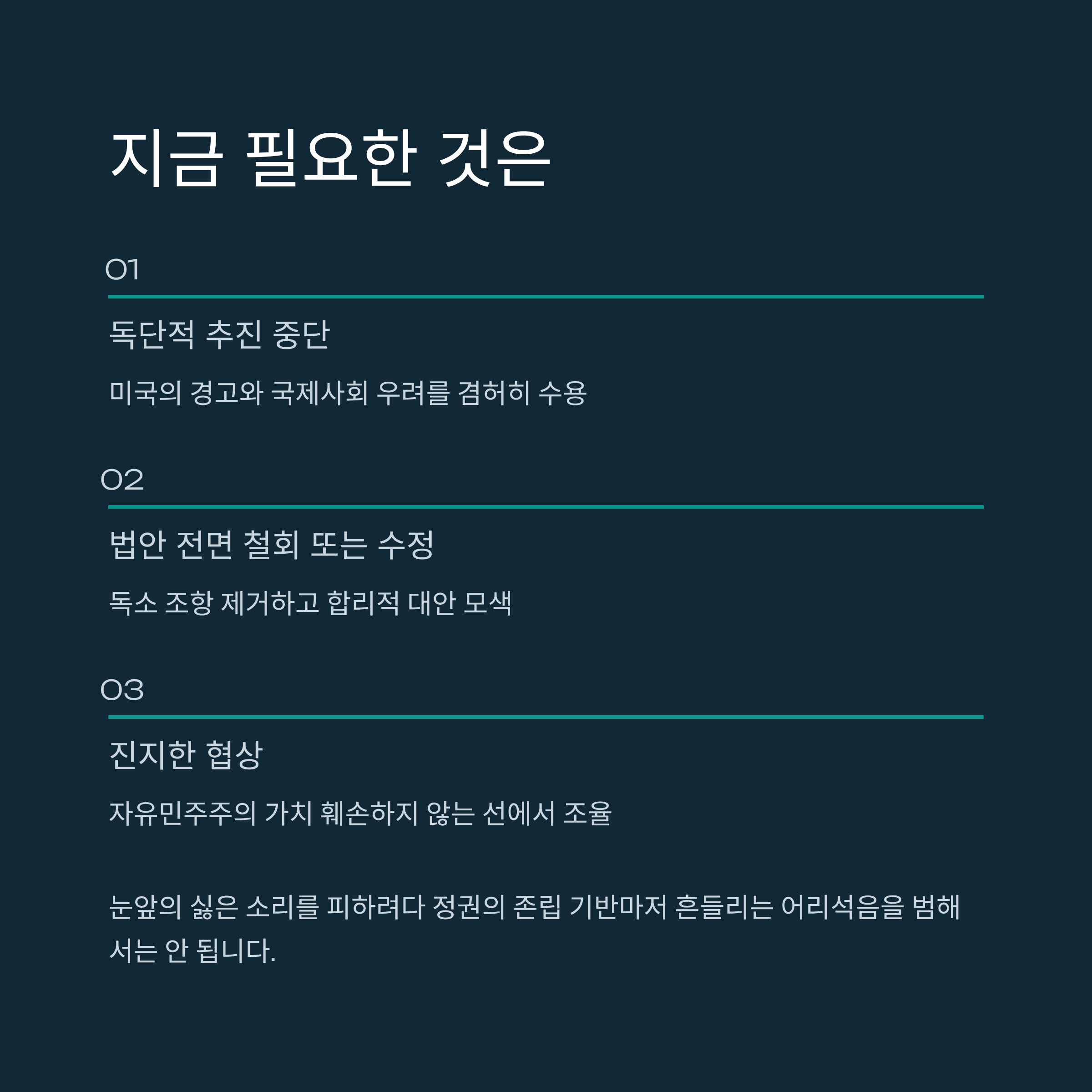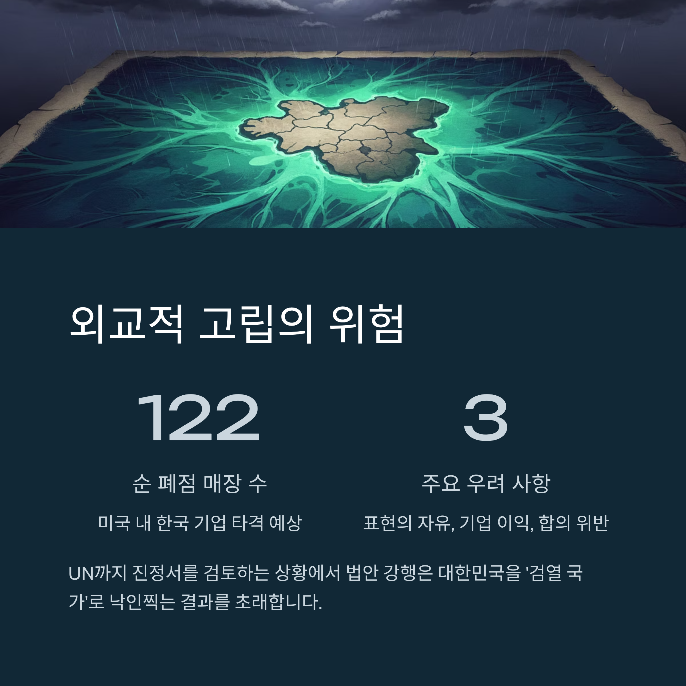 특히 UN까지 관련 진정서를 검토하고 있는 현 상황에서 법안을 무리하게 강행할 경우, 대한민국은 가치를 공유하는 동맹국들로부터 외면당하고 국제 사회에서 고립되는 최악의 상황에 직면할 수 있습니다. 지금은 '팀 USA'와 '팀 차이나'로 대표되는 진영 대결이 심화되는 시기입니다. 이런 상황에서 동맹국의 신뢰를 저버리고 민주주의 가치를 후퇴시키는 행보는 국가의 미래를 담보로 한 위험한 도박과 같습니다. 지금이라도 정부는 독단적인 추진을 멈추고, 미국의 경고와 국제 사회의 우려를 겸허히 받아들여야 합니다. 가장 현명한 방법은 법안을 전면 철회하는 것이지만, 이미 국무회의를 통과한 현실을 고려할 때 차선책으로 법안의 독소 조항을 수정하는 노력이 시급합니다. 자유민주주의 이념을 훼손하지 않고, 미국 기업의 이익을 부당하게 침해하지 않는 선에서 합리적인 대안을 찾는 진지한 숙고와 협상이 필요한 시점입니다. 눈앞의 싫은 소리를 피하려다 정권의 존립 기반마저 흔들리는 어리석음을 범해서는 안 될 것입니다.