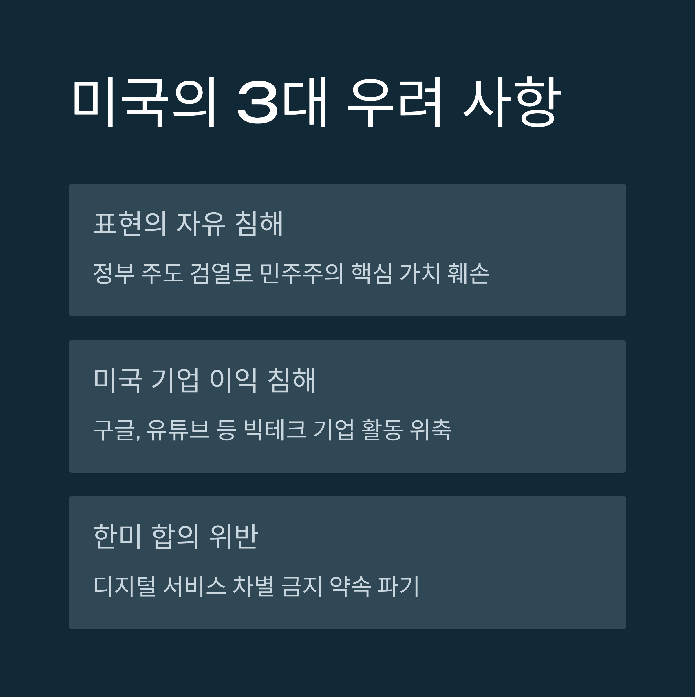| A. 크게 세 가지 이유 때문입니다. 첫째, 정부 주도의 검열로 민주주의의 핵심 가치인 표현의 자유를 침해할 수 있고, 둘째, 구글·유튜브 등 미국 기업의 활동을 위축시켜 경제적 손실을 야기하며, 셋째, 디지털 서비스 차별을 금지한 양국 간 합의를 위반할 소지가 있기 때문입니다. |
