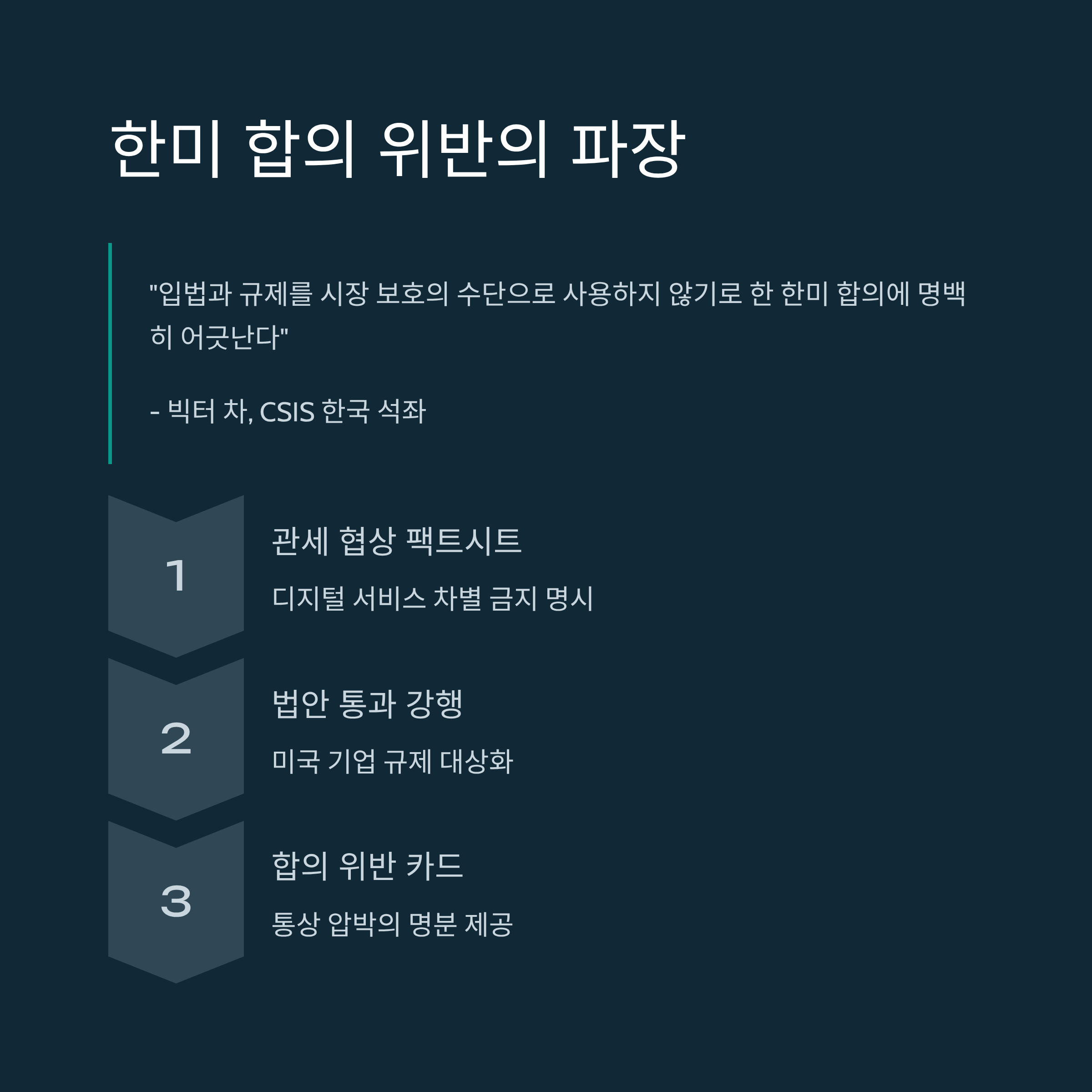 미 전략국제문제연구소(CSIS)의 빅터 차 석좌 역시 "입법과 규제를 시장 보호의 수단으로 사용하는 것을 막는다는 내용이 분명히 명시되어 있다"고 강조하며, 트럼프 행정부가 이 문제를 예민하게 주시하고 있음을 시사했습니다. 이는 단순한 우려를 넘어, 향후 관세 협상이나 통상 문제에서 한국에 불리하게 작용할 수 있는 구체적인 '위반 카드'로 활용될 수 있음을 의미합니다. 이미 여러 차례 비공식적으로 우려를 전달했음에도 불구하고 법안 통과를 강행한 만큼, 미국은 이제 공식적인 합의 위반 문제를 제기하며 한국 정부를 더욱 강하게 압박할 명분을 얻게 된 셈입니다.
