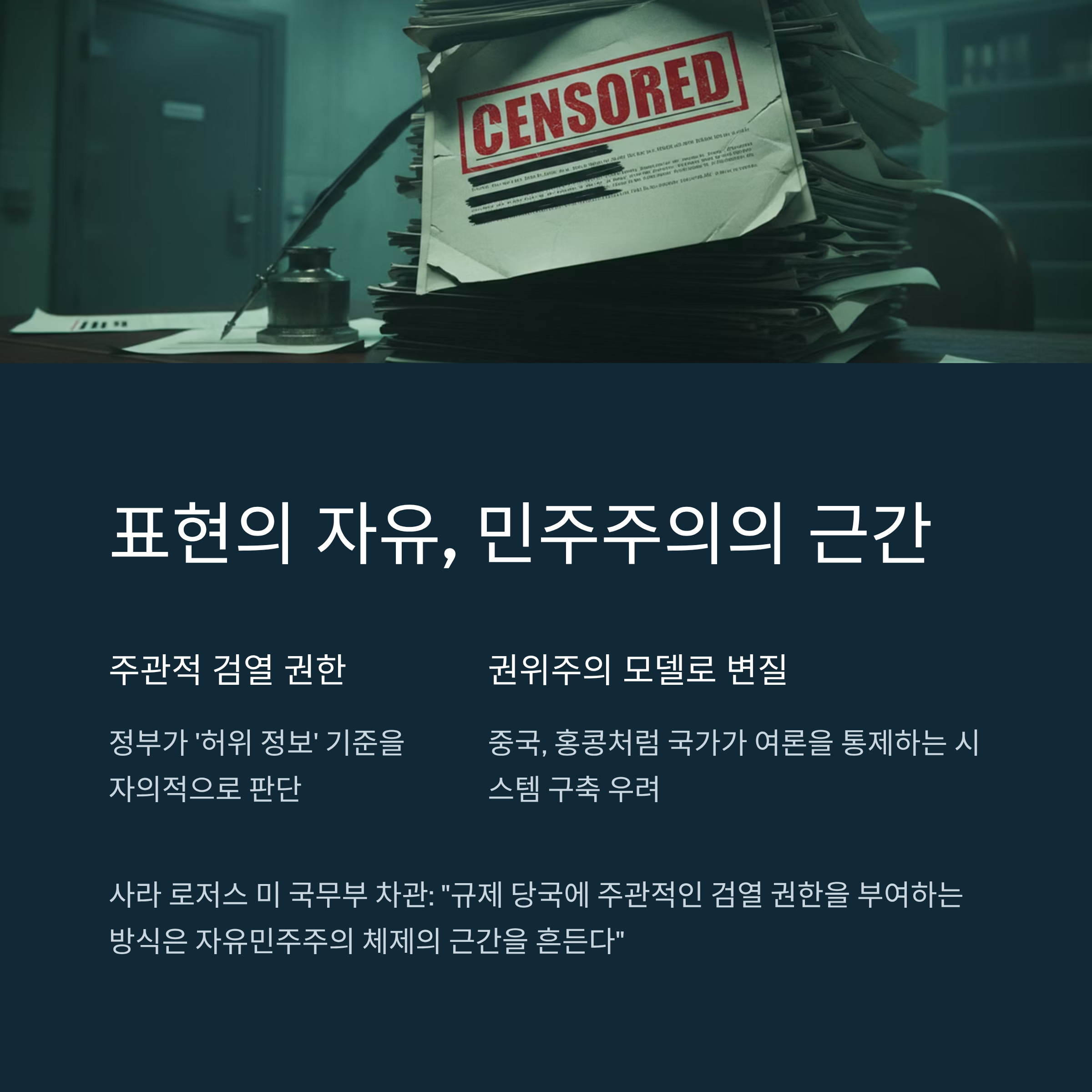 미국이 이번 법안에 대해 가장 근본적으로 우려하는 지점은 바로 자유민주주의 체제의 근간을 이루는 '표현의 자유'가 심각하게 훼손될 수 있다는 점입니다. 사라 로저스 미 국무부 차관이 지적했듯, 해당 법안은 피해자 개인의 민사적 구제책을 강화하는 대신, 규제 당국에 '주관적인 검열 권한'을 부여하는 방식을 택하고 있습니다. 이는 정부가 '허위 정보'라는 모호한 기준을 자의적으로 판단하여 특정 의견이나 콘텐츠를 통제할 수 있는 길을 열어주는 것으로, 사실상 국가 주도의 검열 시스템을 구축하는 것과 다름없습니다.