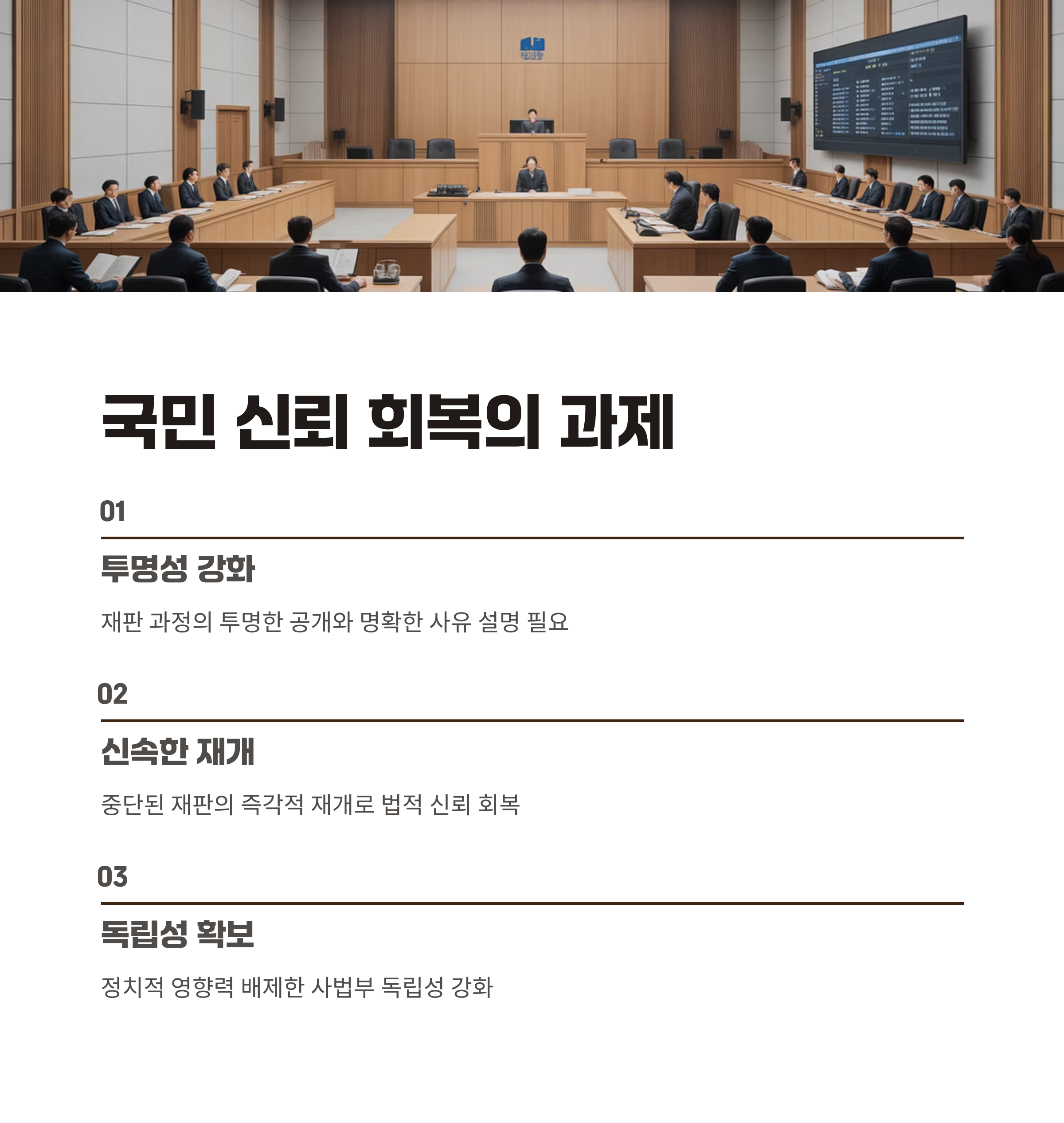사법부에 대한 신뢰는 법과 정의를 올바르게 실현하는 데 필수적입니다. 그러나 이번 사건은 사법부의 독립성과 신뢰성에 심각한 타격을 입혔습니다. 장동혁 국민의 힘 대표가 판사들의 실명을 공개한 점은 국민들로 하여금 사법부에 대한 불만을 더 구체화시키는 계기가 되었습니다. 국민들이 법과 공정성에 대한 신뢰를 잃는다면, 이는 장기적으로 국가 체계 전반에 치명적인 영향을 미칠 수 있습니다. 신뢰 회복을 위해 투명성을 강화하고 결과 기반의 명확한 행동 지침을 수립해야 합니다.