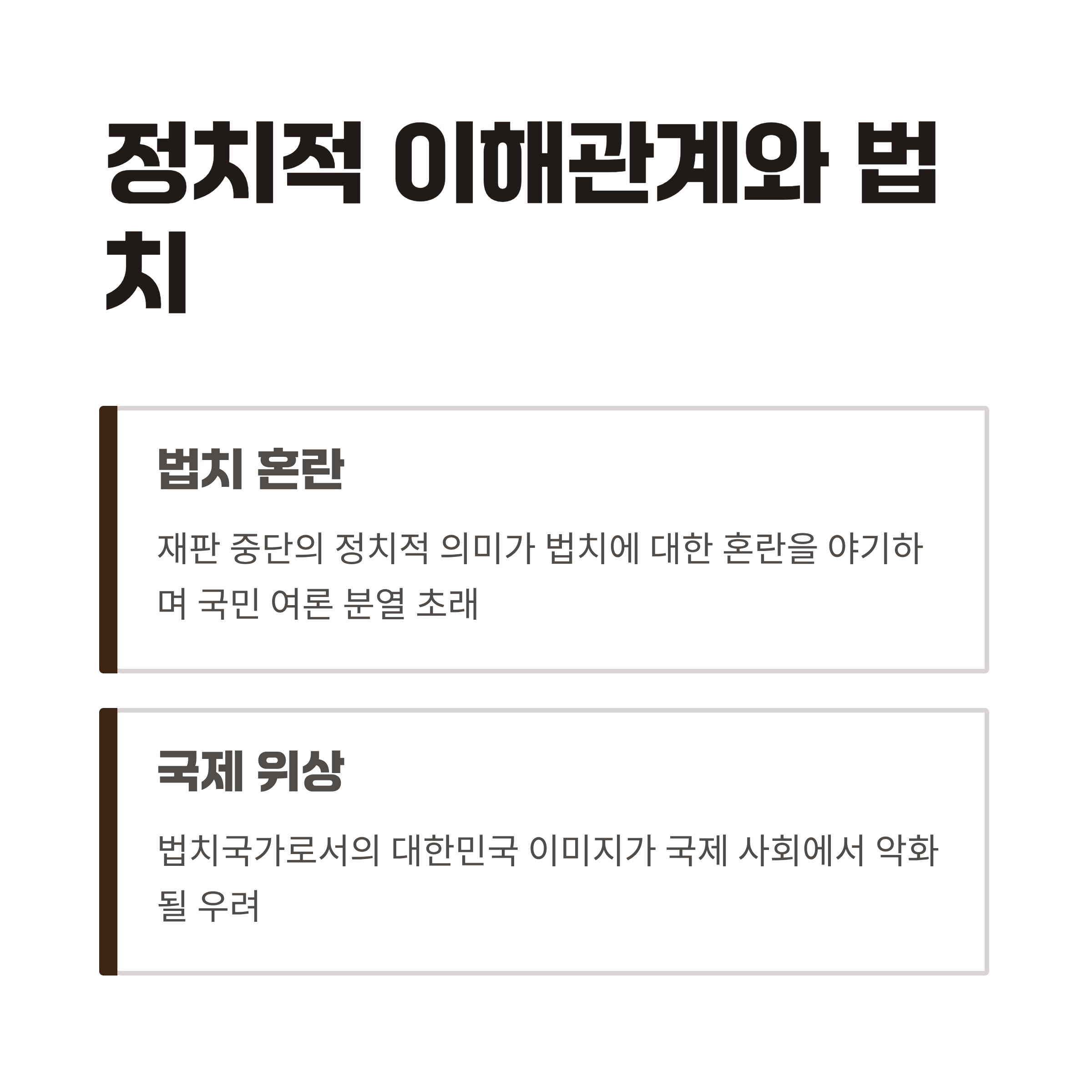 | A. 재판 중단은 국민의 법적 신뢰도를 떨어뜨릴 위험이 크며, 사회적 혼란과 정치적 갈등을 초래할 가능성이 큽니다. |