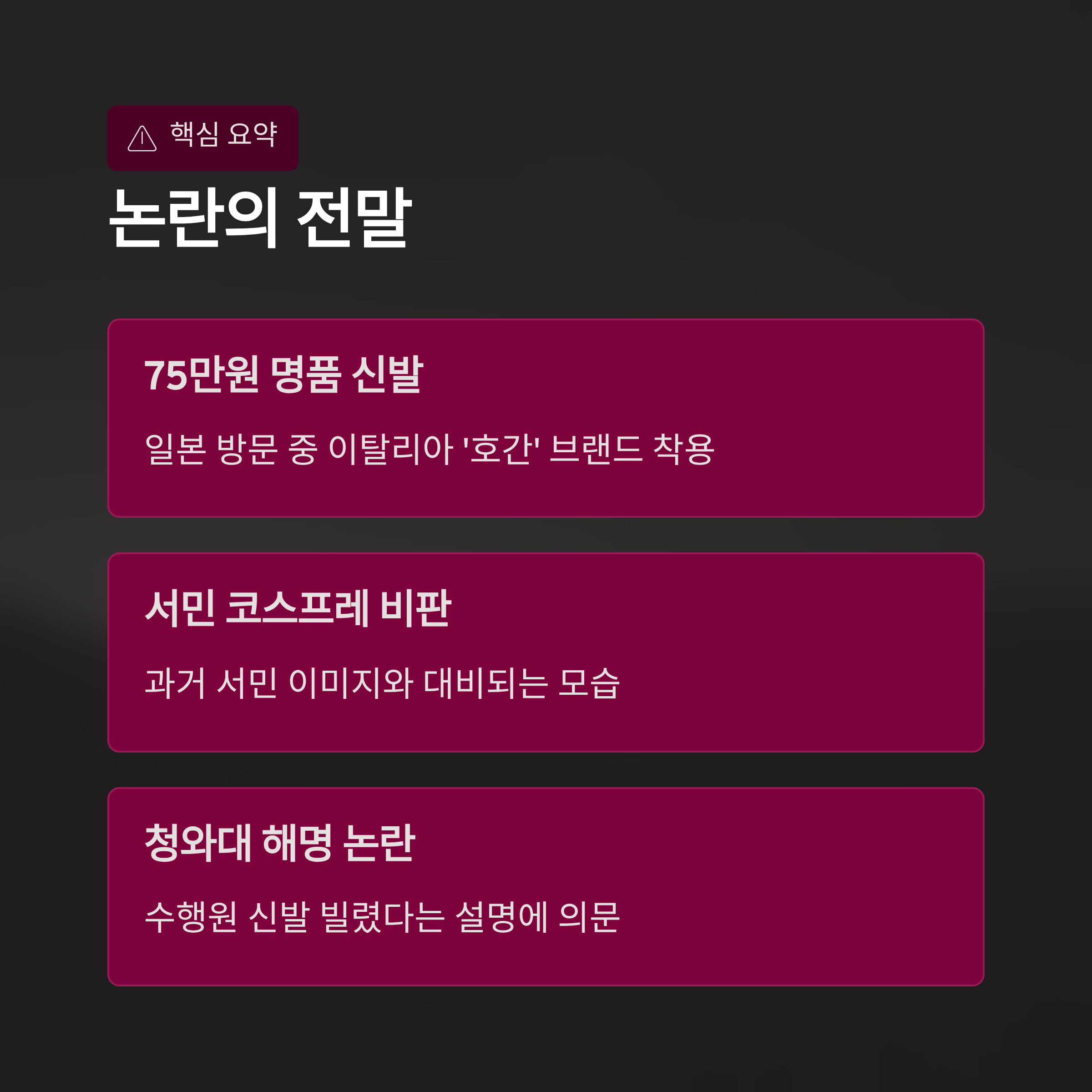 | A. 약 75만 원에 달하는 고가의 명품 브랜드 제품이었기 때문입니다. 이는 그동안 그와 소속 정당이 내세워 온 서민적 이미지와 배치되어 '서민 코스프레'라는 비판을 받았습니다. 논란의 본질은 가격보다 정치인의 말과 행동의 불일치에 대한 실망감입니다. |