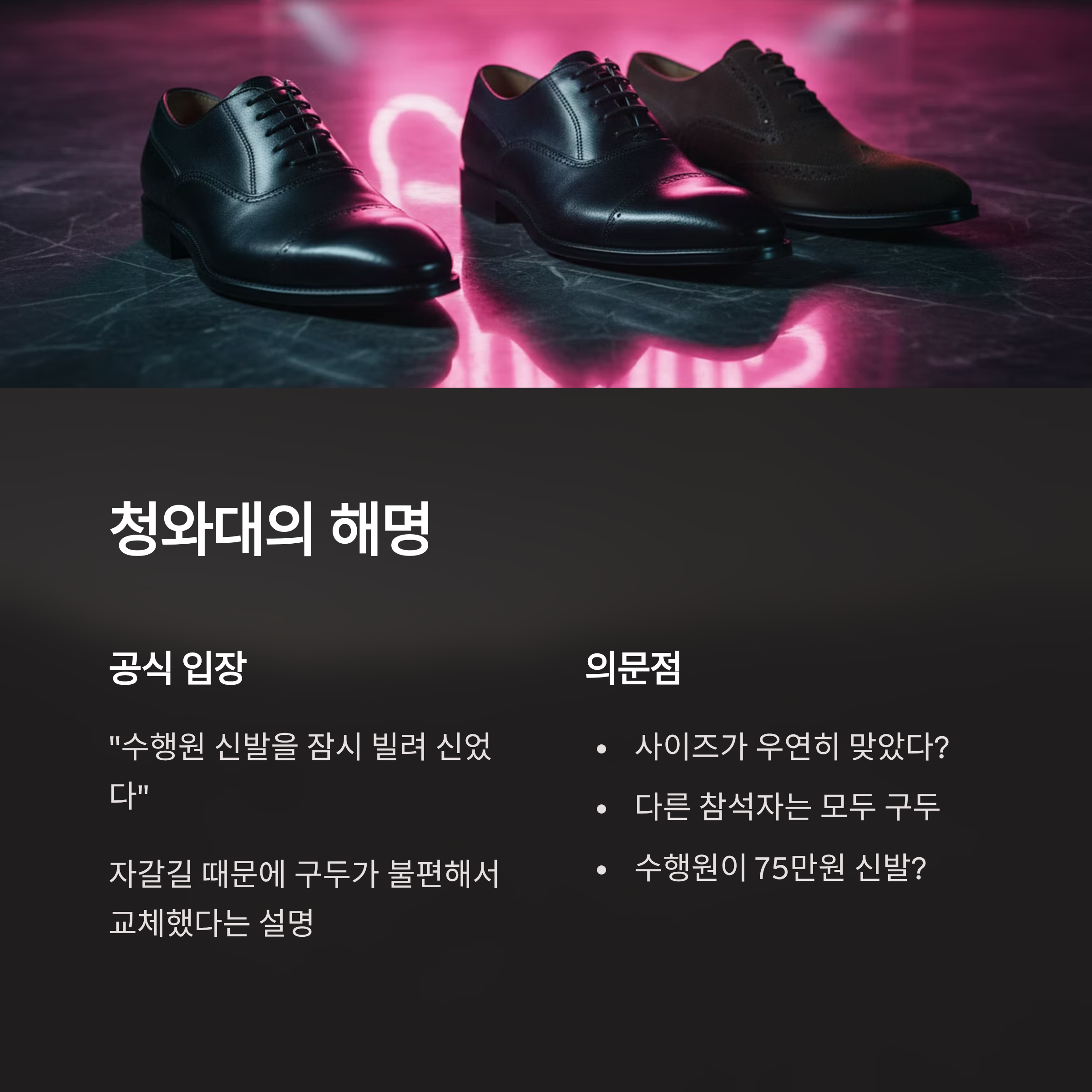 청와대는 "수행원 신발을 빌려 신었다"고 해명했지만, 사이즈 문제와 현장 상황을 고려할 때 해명의 신빙성에 대한 의문은 증폭되고 있습니다.