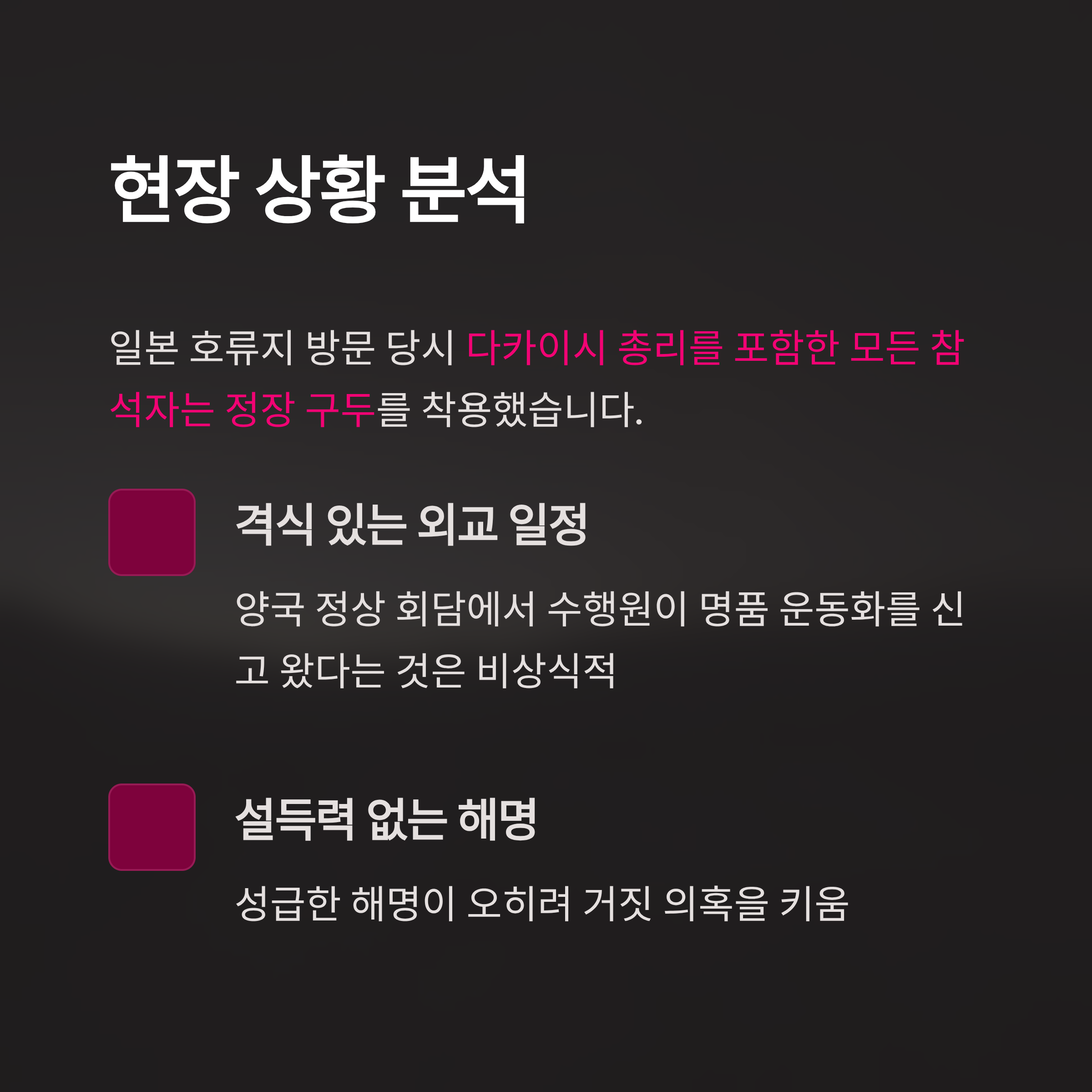 더욱이 현장 사진을 보면 이 대통령을 제외한 일본 다카이시 총리를 비롯한 모든 참석자는 정장용 신발을 신고 있습니다. 오직 대통령 한 사람을 위해 '길이 험하다'는 이유를 드는 것은 설득력이 떨어집니다. 또한, 양국 정상이 만나는 격식 있는 외교 일정에 수행원이 75만 원짜리 명품 운동화를 신고 왔다는 것 자체도 비상식적입니다. 결국 청와대의 성급한 해명은 의혹을 해소하기는커녕 '거짓 해명'이라는 더 큰 의혹을 낳으며 사태를 악화시켰습니다.