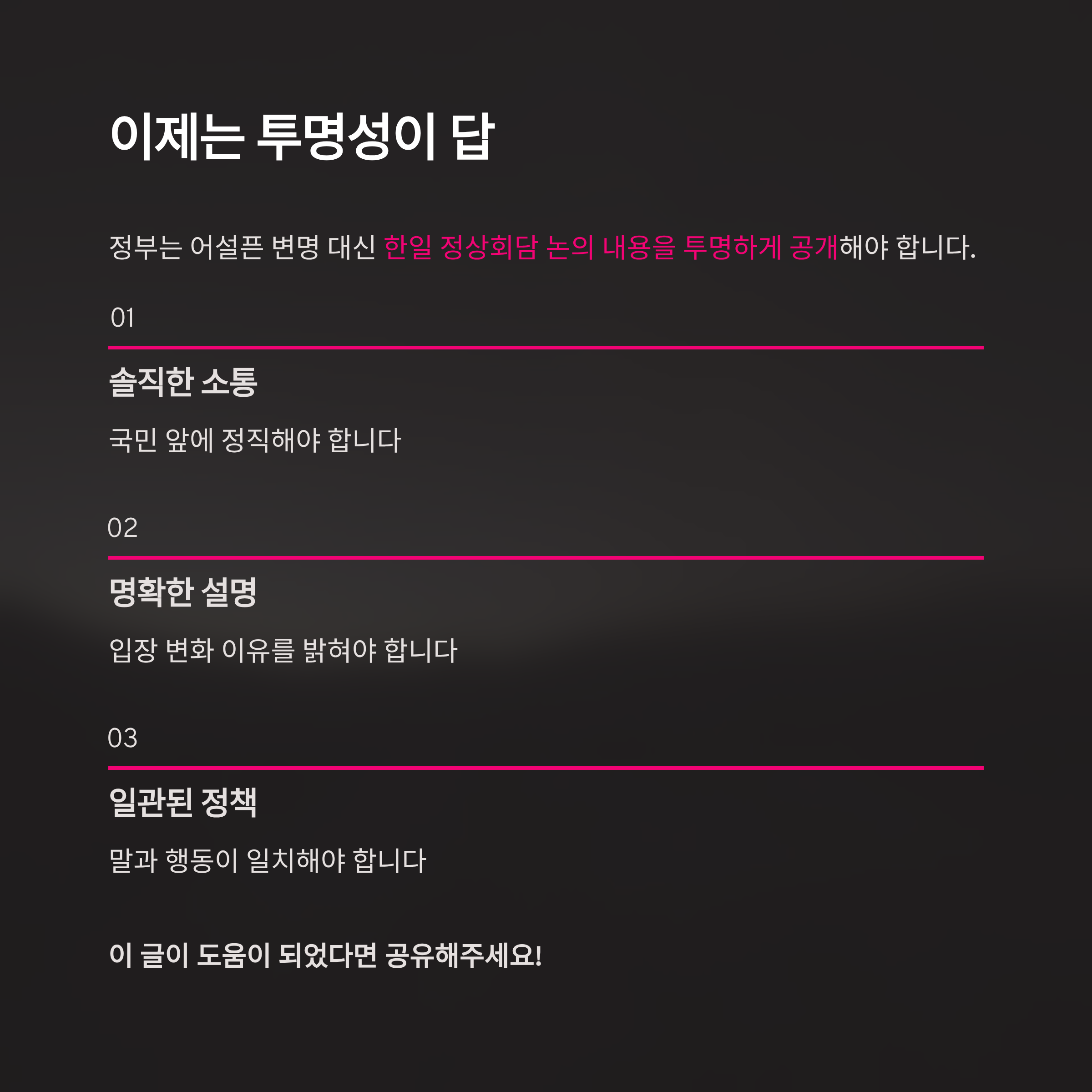 이제 정부는 어설픈 서민 코스프레나 납득하기 힘든 변명 대신 국민 앞에 솔직해야 합니다. 한일 정상회담에서 후쿠시마 수산물 문제에 대해 어떤 논의가 오갔는지 투명하게 공개하고, 만약 과거와 입장이 바뀌었다면 그 이유를 명확히 설명하고 국민의 이해를 구해야 합니다. 일관성 없는 정책과 이중적 태도는 결국 국민의 신뢰를 잃게 만들 뿐입니다. 이번 사태를 계기로 정부는 말과 행동이 일치하는 책임감 있는 자세로 국정에 임해야 할 것입니다.