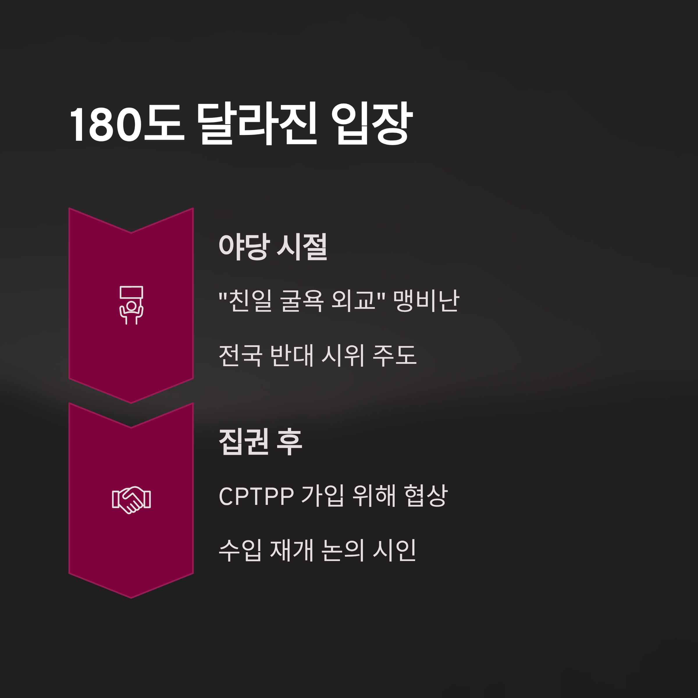 이재명 대통령의 75만 원짜리 운동화 논란은 그의 '서민' 이미지와 실제 모습 사이의 간극을 드러내며 시작되었습니다. 청와대의 어설픈 해명은 불신을 키웠고, 이는 더 큰 문제의 서막에 불과했습니다. 진짜 핵심은 야당 시절 그토록 반대했던 후쿠시마 수산물 수입 문제를 CPTPP 가입을 위해 협상 테이블에 올렸다는 점입니다. 이는 국민의 건강과 국가의 자존심이 걸린 문제를 대하는 정치적 입장이 얼마나 가볍고 이중적인지를 드러내는 '내로남불'의 전형입니다.