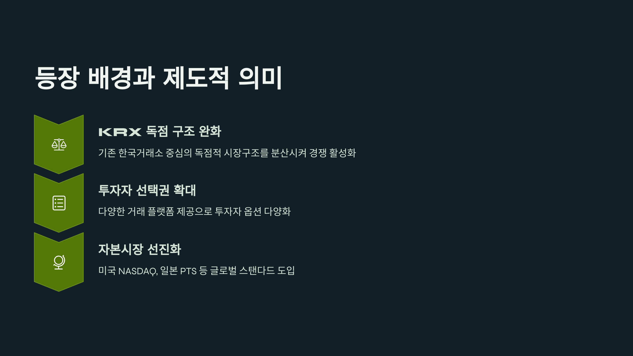 그동안 한국 주식시장은 한국거래소(KRX) 단일 체제로 운영되어 왔습니다. 하지만 최근 거래 활성화 정체, 글로벌 거래 환경과의 경쟁력 저하 문제 등이 대두되면서, 금융당국은 대체거래소(Alternative Trading System) 도입을 추진하게 되었습니다. 이로써 투자자들은 이제 KRX와 NXT 두 거래소 중 유리한 조건을 선택해 거래할 수 있게 되었고, 이는 거래 환경의 효율성과 투명성 제고에 기여할 것으로 기대됩니다.