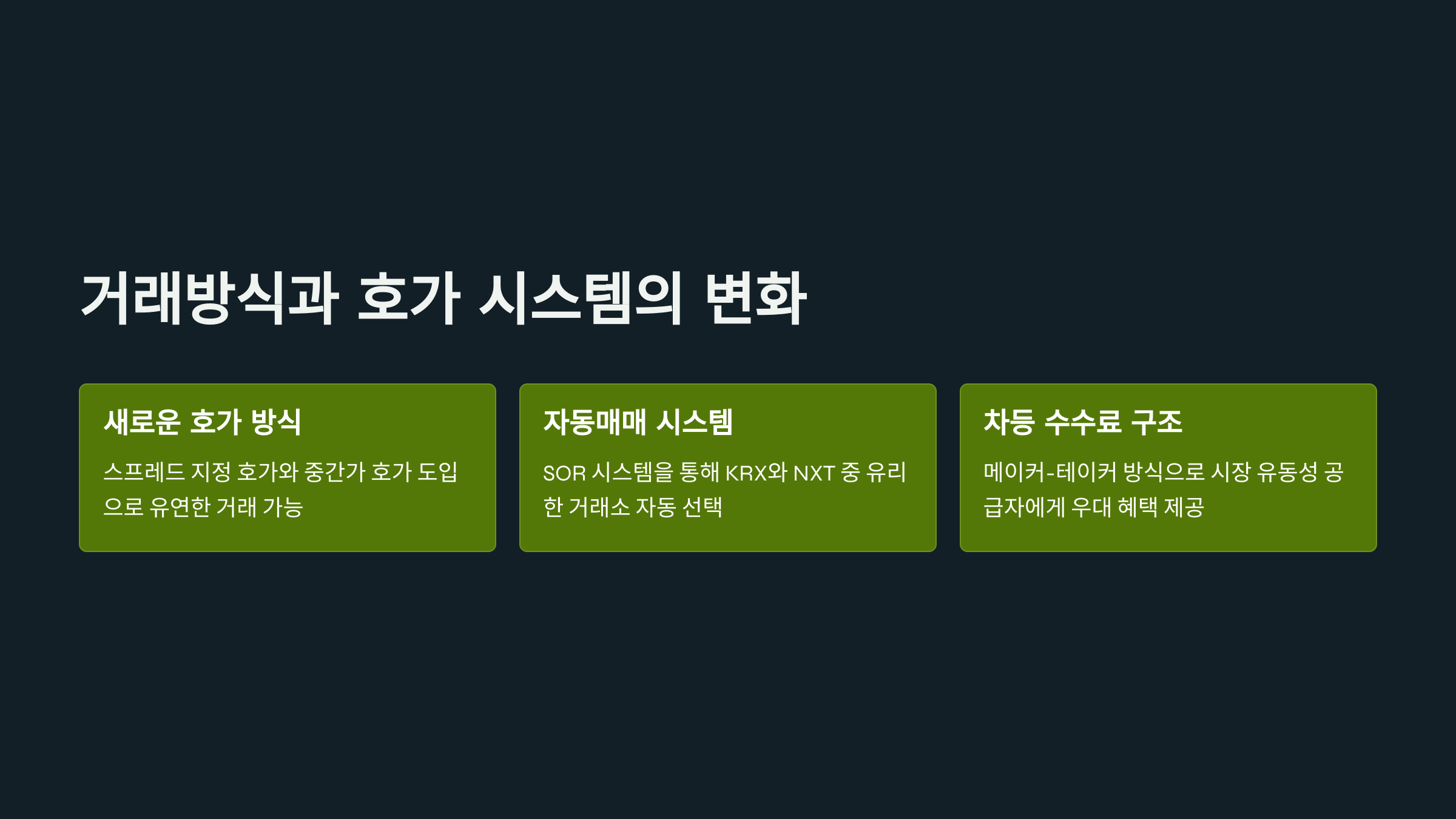 NXT는 거래 편의성을 위해 자동주문선택(SOR) 시스템을 도입했습니다. 이는 투자자가 주문을 넣을 때, KRX와 NXT 중 유리한 거래 조건을 자동으로 탐지해 주문을 배분하는 기능입니다. 이 시스템은 투자자의 부담을 줄이고, 동시에 두 거래소 간 경쟁을 촉진하는 구조로 작동할 수 있습니다.