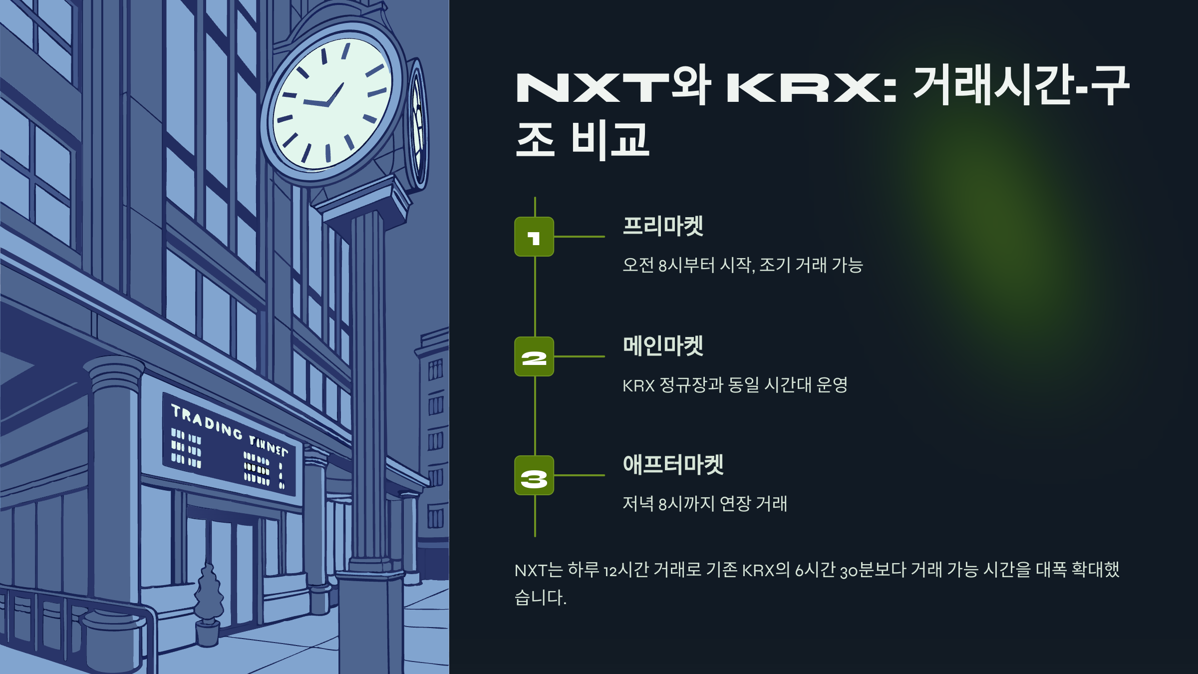 2025년 출범한 NXT(넥스트마켓)는 한국 최초의 대체거래소로, 기존 한국거래소(KRX) 외에 새로운 주식 거래 플랫폼입니다. 정규장 외에도 오전 8시부터, 저녁 8시까지 거래 가능해져 직장인 투자자 등 다양한 투자 수요를 흡수할 수 있습니다.