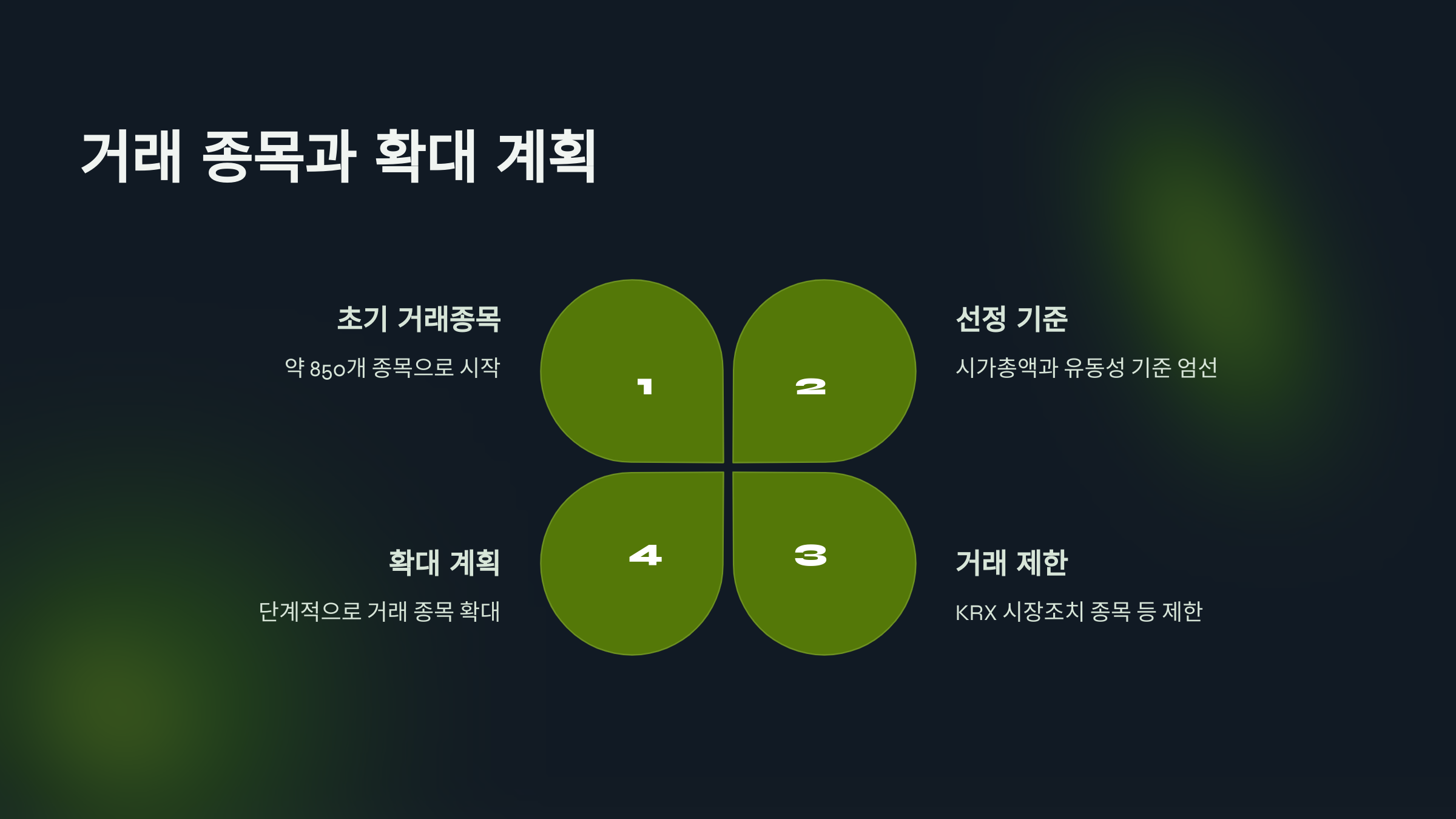 | 초기 거래 종목 수 | 전 종목 | 850여 종목 |