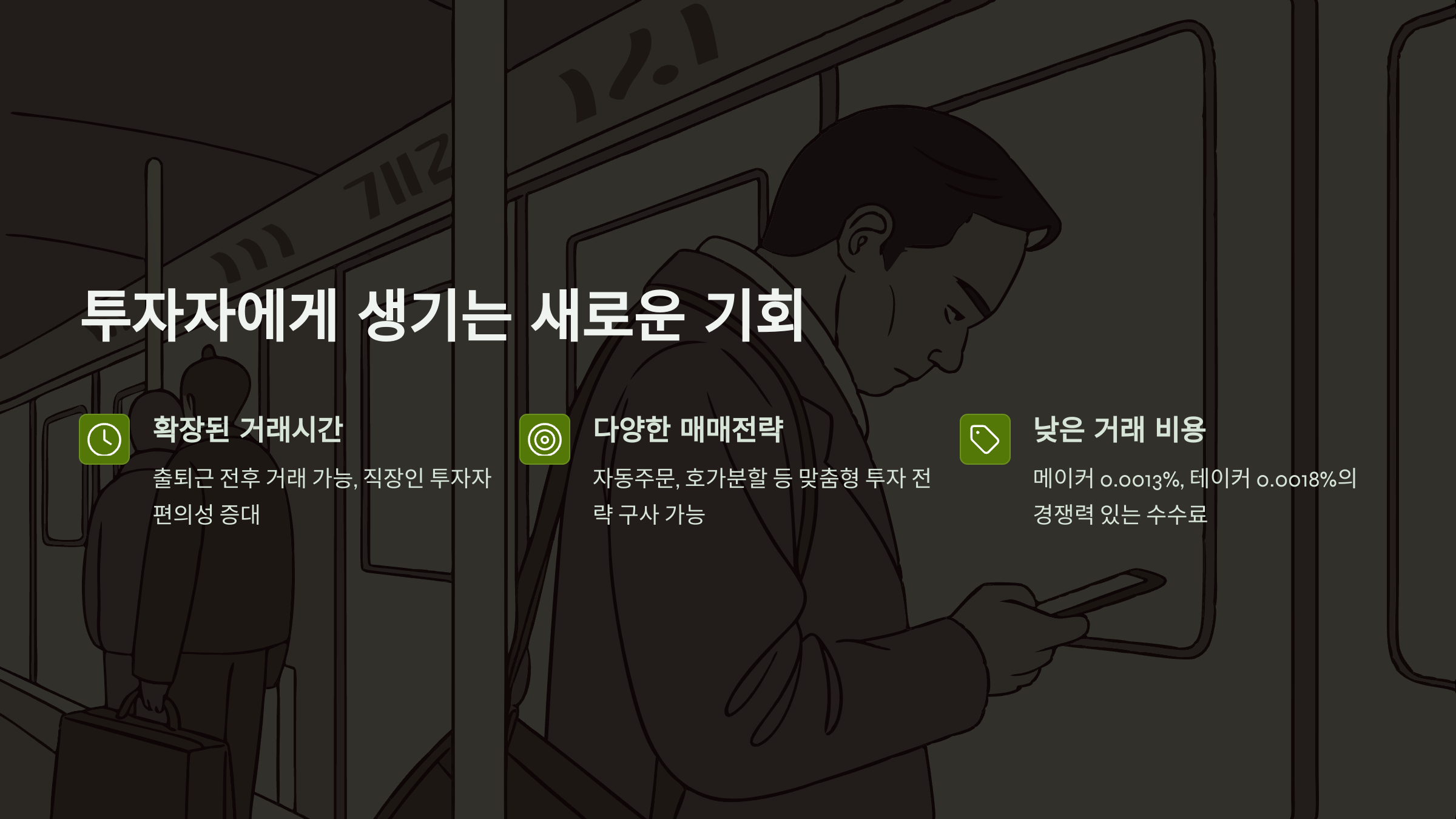 기존 정규장 외에도 오전 8시 프리마켓, 오후 8시까지 애프터마켓 및 야간거래가 가능합니다.