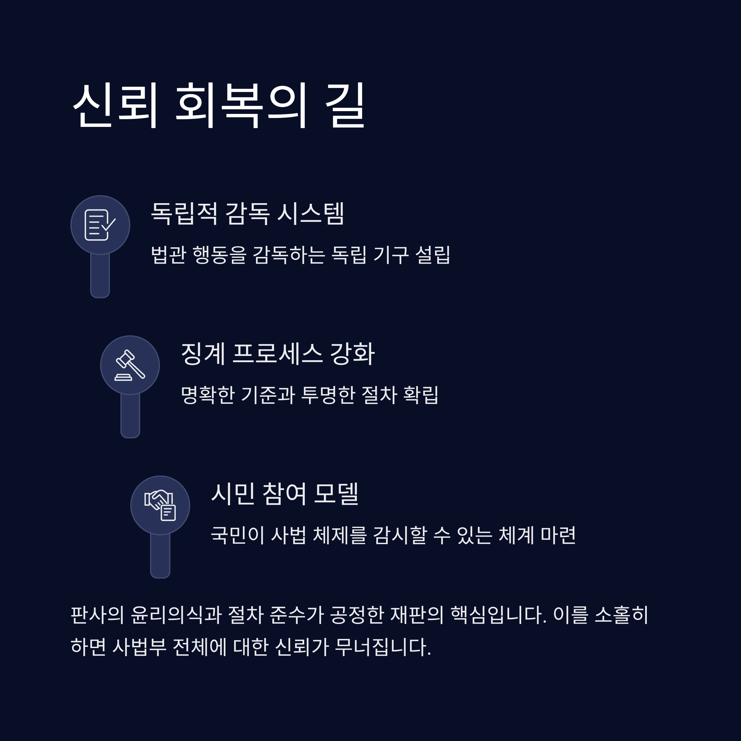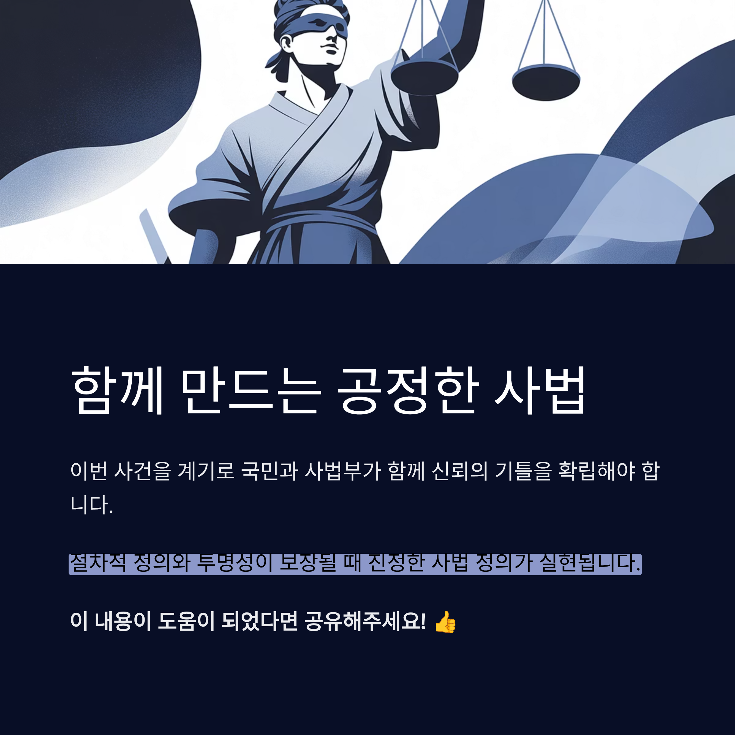 이번 사건은 법관의 권한 남용과 절차적 공정성 부재를 경고하는 신호로 해석됩니다. 공정한 재판을 가능하게 하는 핵심 요소는 판사의 윤리의식과 절차 준수입니다. 이를 소홀히 한다면 사법부 전체에 대한 신뢰가 떨어질 수밖에 없습니다. 이진관 판사 사건을 계기로 법관의 행동을 감독하는 독립적인 시스템 구축과 징계 프로세스 강화가 요구됩니다.