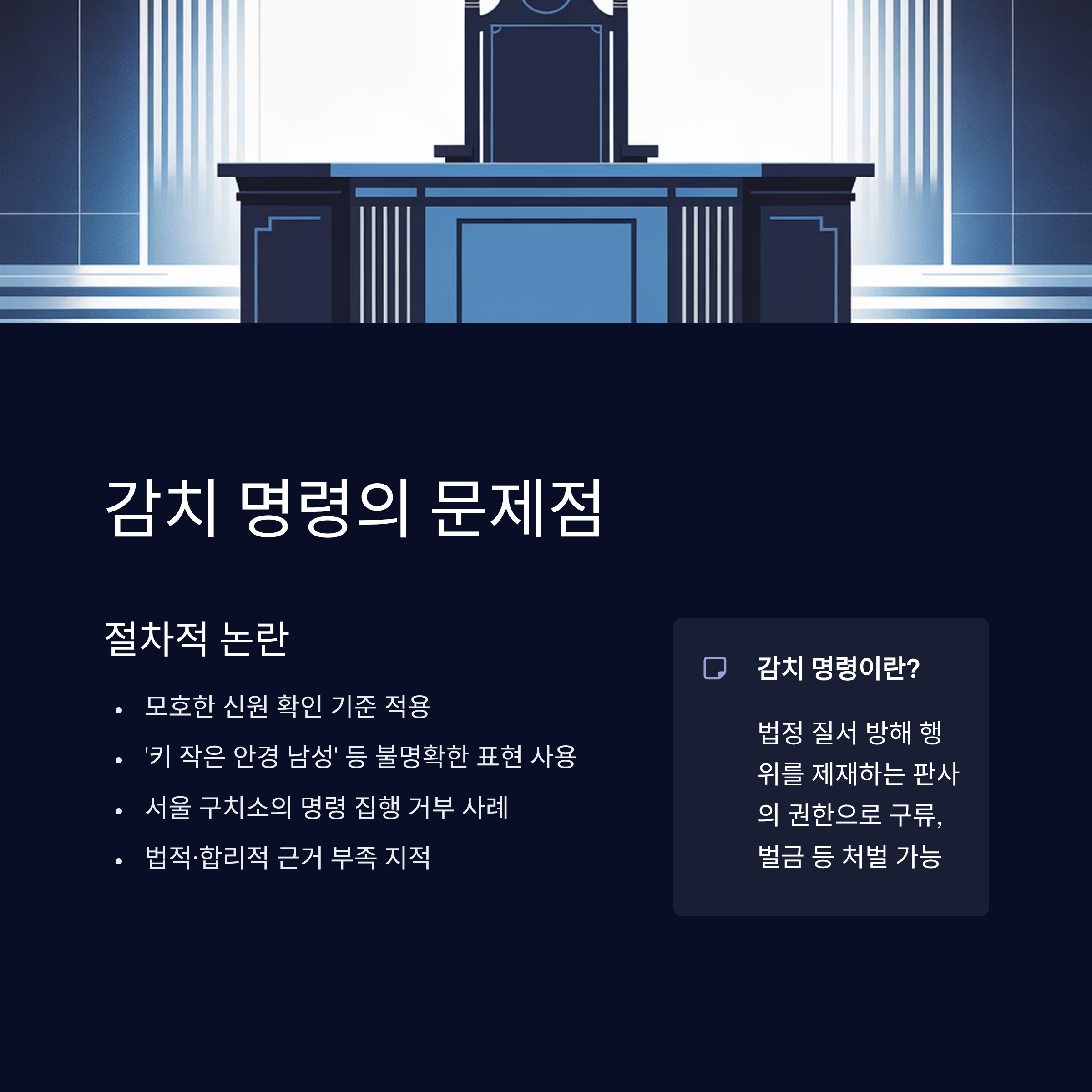 서울 구치소 측이 해당 명령 집행을 거부한 사례는 판사의 권한이 법적·합리적 근거를 무시했을 가능성을 보여줍니다. 원칙적으로 감치 명령은 명확한 신원 확인과 구체적 사유 제시를 포함해야 하지만, 이번 사건에서는 그 절차가 생략되었거나 불투명한 방식으로 이루어진 점이 드러났습니다.