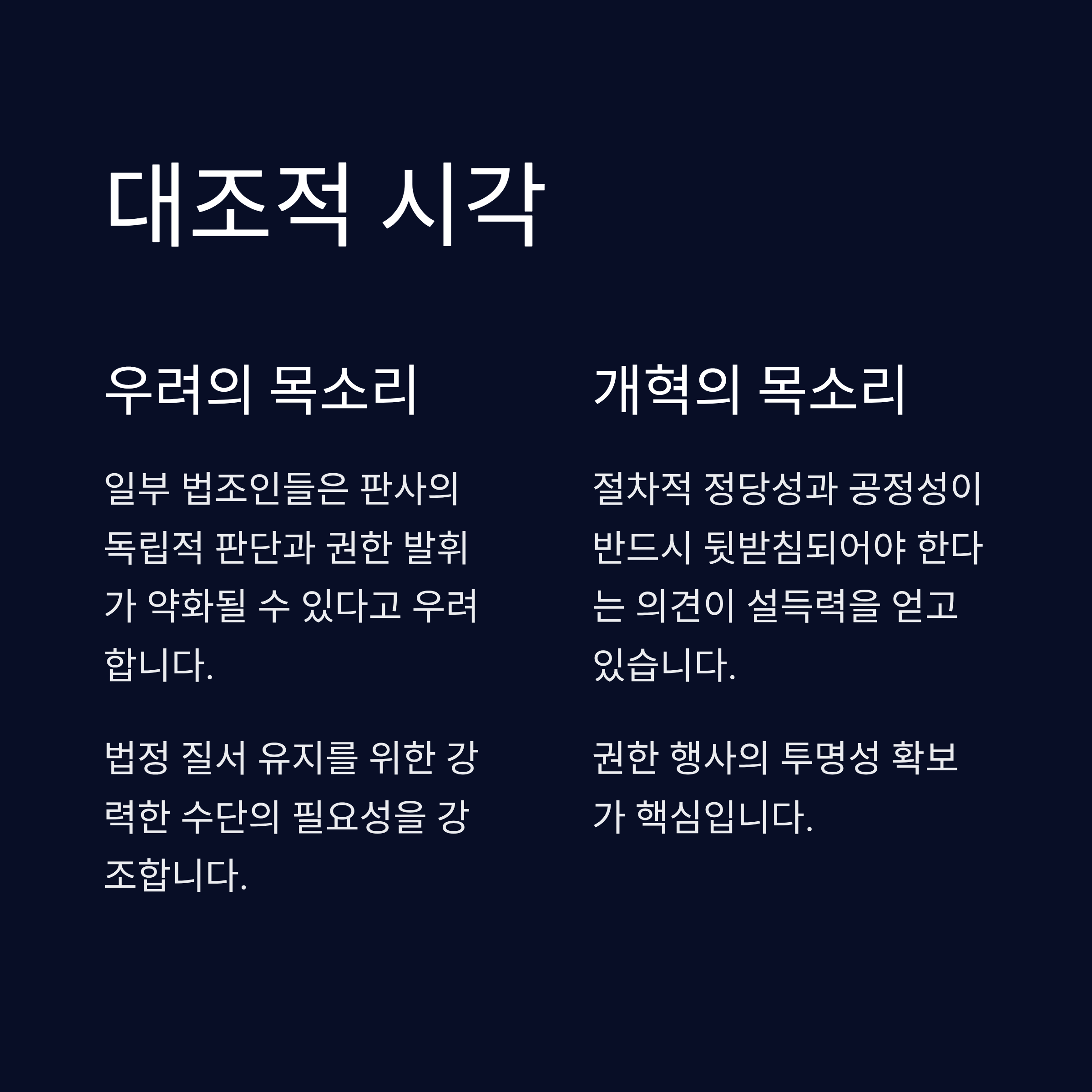 반대로, 일부 법조인들은 이런 논란이 판사의 독립적 판단과 권한 발휘를 약화시킬 수 있다고 우려합니다. 법정 질서를 유지하기 위해 감치 명령은 불가피한 강력한 수단으로 유지되어야 하지만, 그 절차적 정당성과 공정성이 반드시 뒷받침되어야 한다는 목소리가 설득력을 얻고 있습니다.
