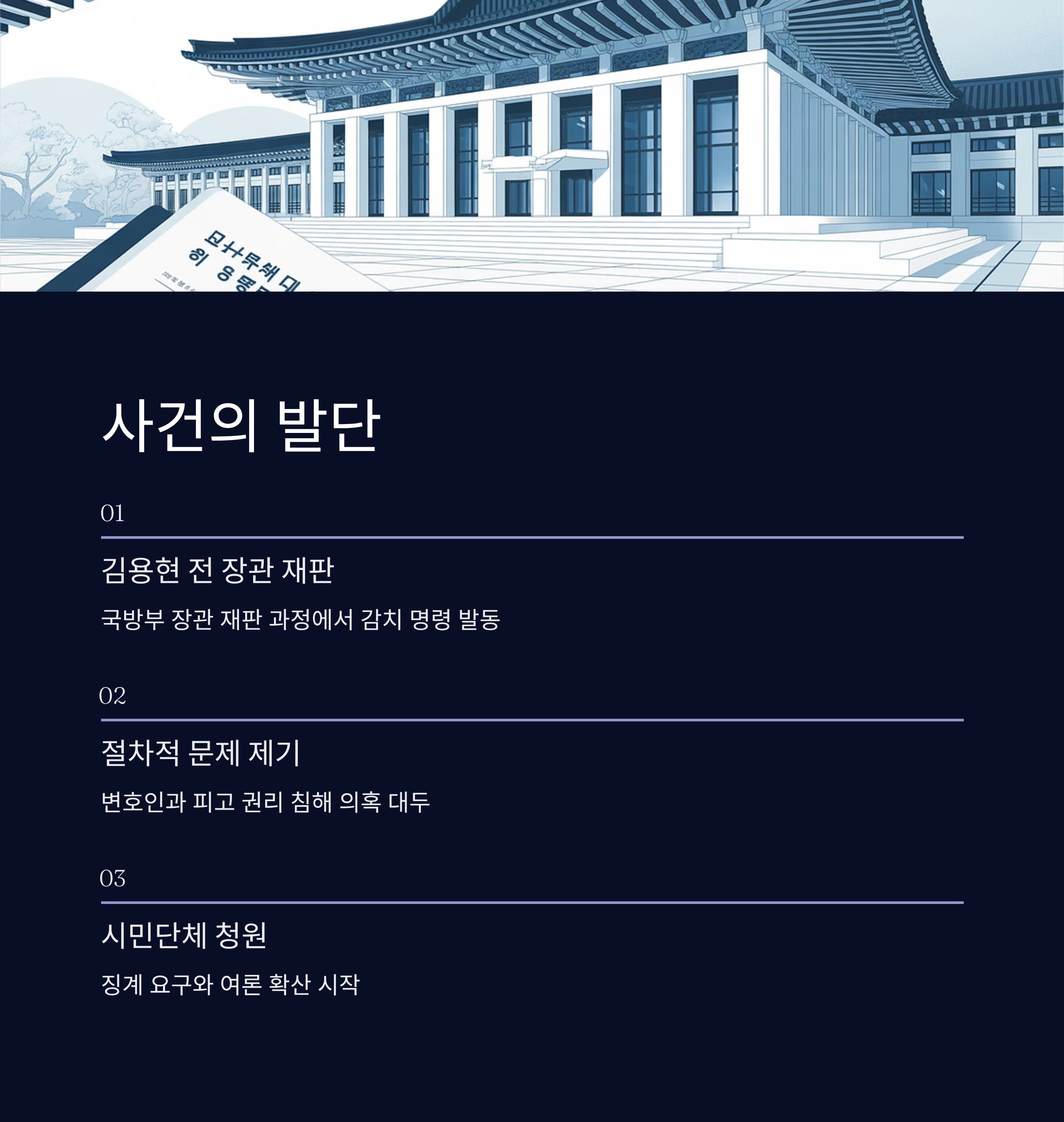 최근 서울중앙지방법원의 이진관 부장판사가 참여한 재판에서 내린 감치 명령이 뜨거운 논란의 중심에 서 있습니다. 감치 명령은 법정 질서를 유지하기 위한 판사의 권한이지만, 이번 사건은 그 절차적 적법성과 공정성에 대한 질문을 던지게 합니다. 이는 김용현 전 국방부 장관의 재판 과정에서 발단된 것으로, 변호인과 피고의 권리를 포함한 기본 절차가 준수되지 않았다는 지적이 제기되었습니다. 이에 시민단체를 중심으로 징계 청원이 잇따르고 있습니다. 본 글에서는 이번 사건의 주요 논란 쟁점, 시민 반응, 법조계의 의견을 분석하여 사건의 의미를 다각도로 조명하고자 합니다.