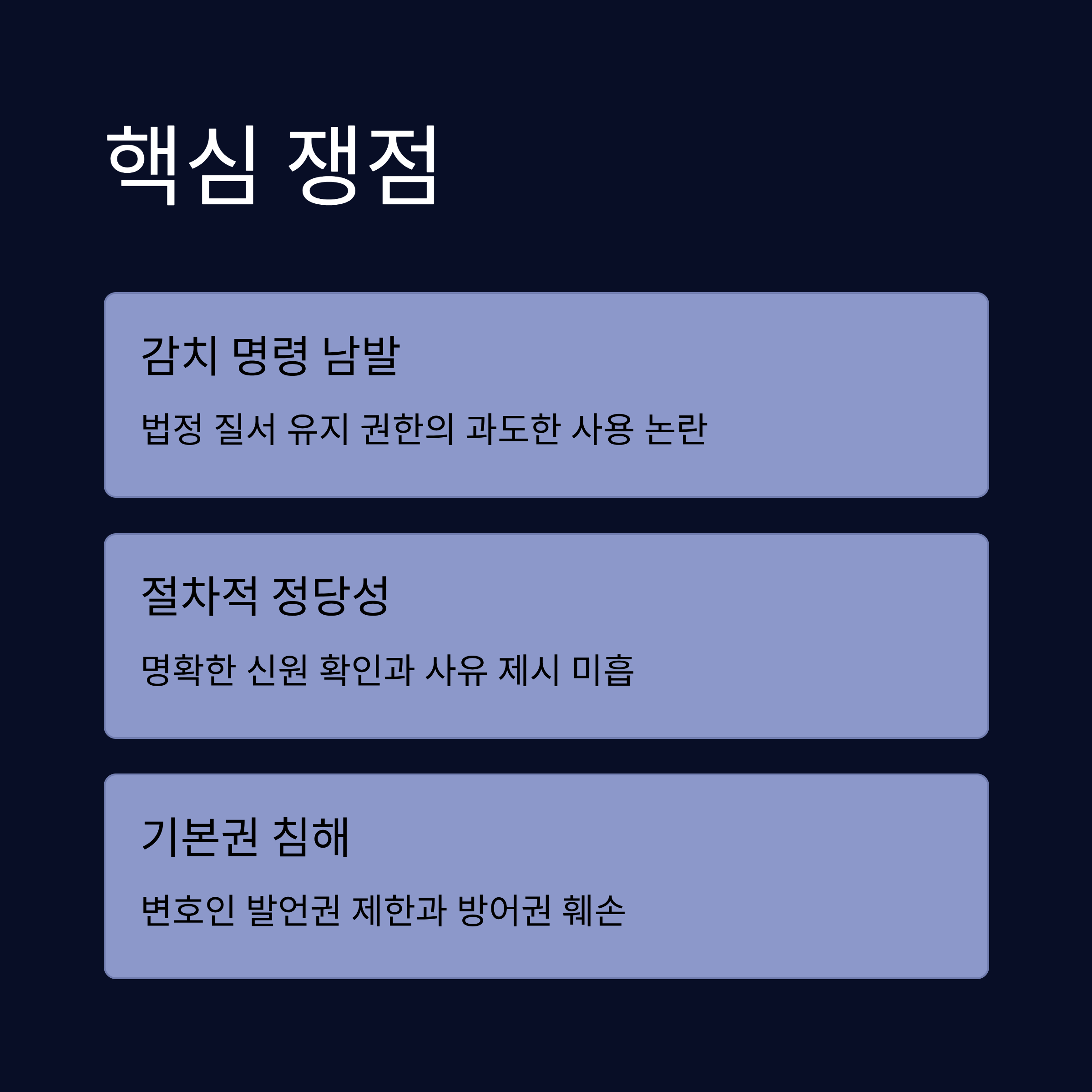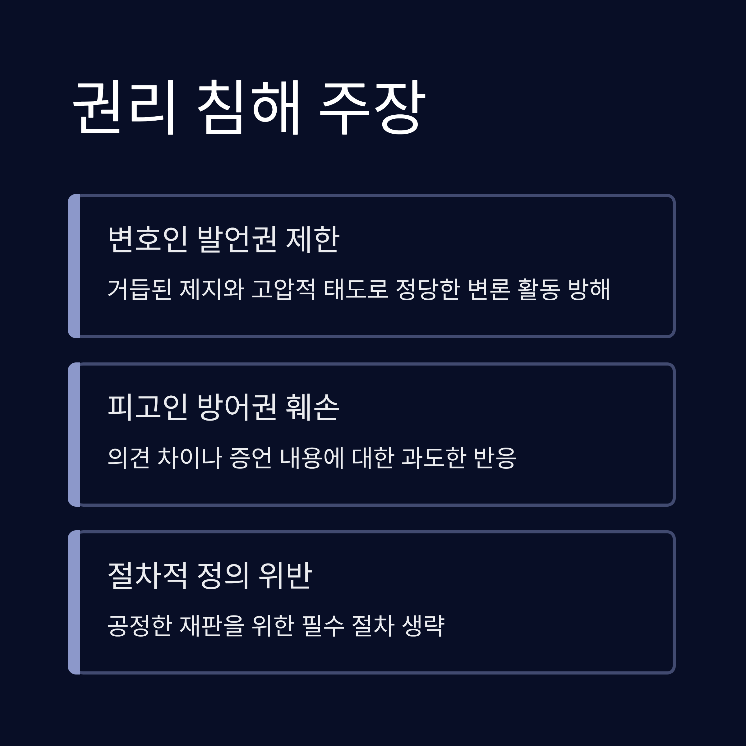 감치 명령 남용 논란 외에도 변호인 및 피고인의 발언권이 제한되었다는 주장 역시 재판의 공정성 문제를 제기합니다. 변호인이 발언권을 행사하려 할 때 거듭된 제지와 고압적 태도가 목격되며, 피고인의 정당한 방어권이 심각히 훼손되었다는 비판이 나오고 있습니다. 이는 재판 과정에서의 필수적인 절차적 정의와도 결부된 문제입니다.