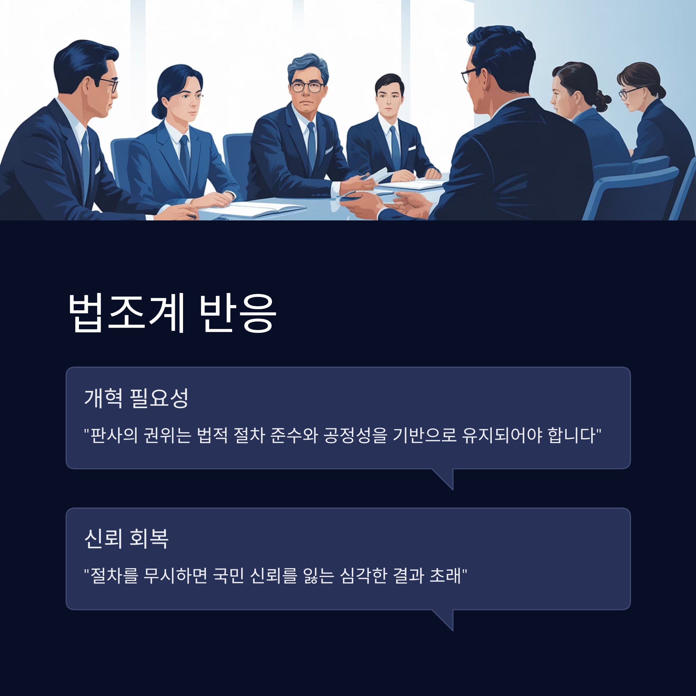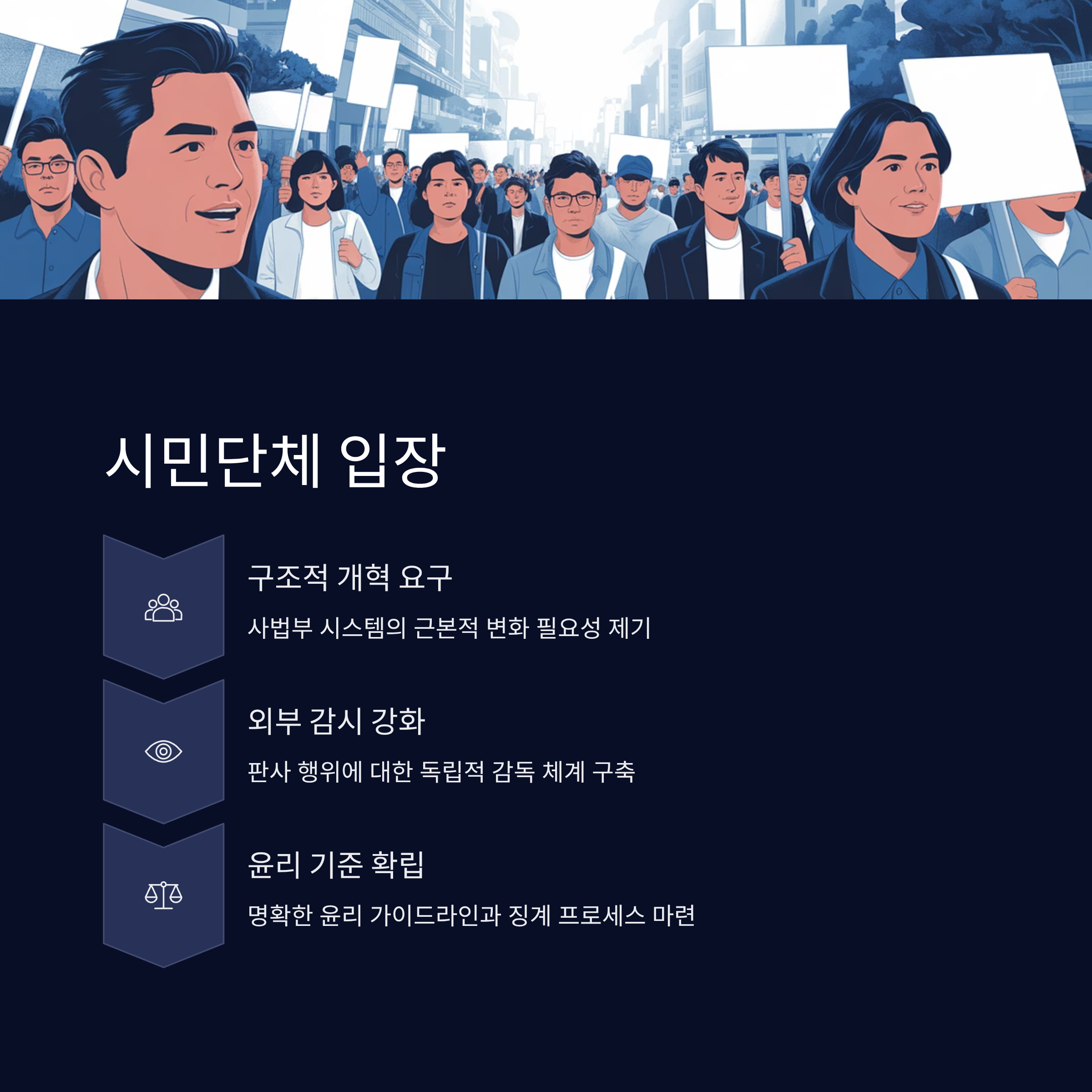 법조계에서는 이번 사건이 사법부와 판사의 역할을 재정의해야 하는 계기로 평가받고 있습니다. 일부 법조 전문가들은 “판사의 권위는 법적 절차 준수와 공정성을 기반으로 유지되어야 하며, 그렇지 않을 경우 국민 신뢰를 잃는 심각한 결과를 초래한다”고 지적했습니다. 시민단체들도 이번 사건을 통해 사법부의 구조적 개혁 필요성을 주장하며, 판사들의 행위에 대한 외부적 감시와 윤리 기준 강화의 필요성을 강조하고 있습니다.