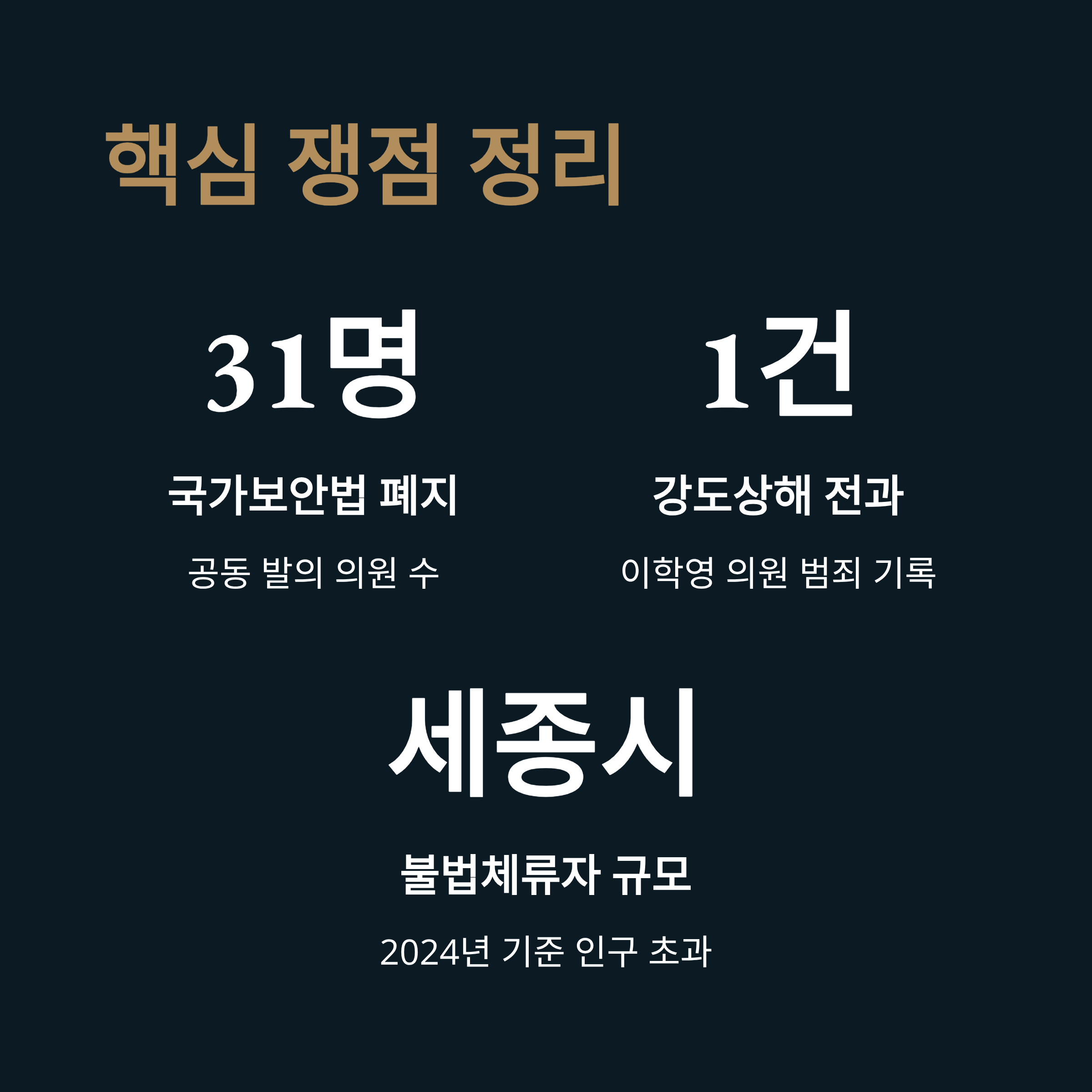 이와 동시에 구 통합진보당의 후신인 진보당이 불법체류자의 인권을 내세워 사실상 강제추방을 무력화하는 법안을 발의하는 것은 이들 세력의 정책 우선순위가 어디에 있는지를 명확히 보여줍니다.