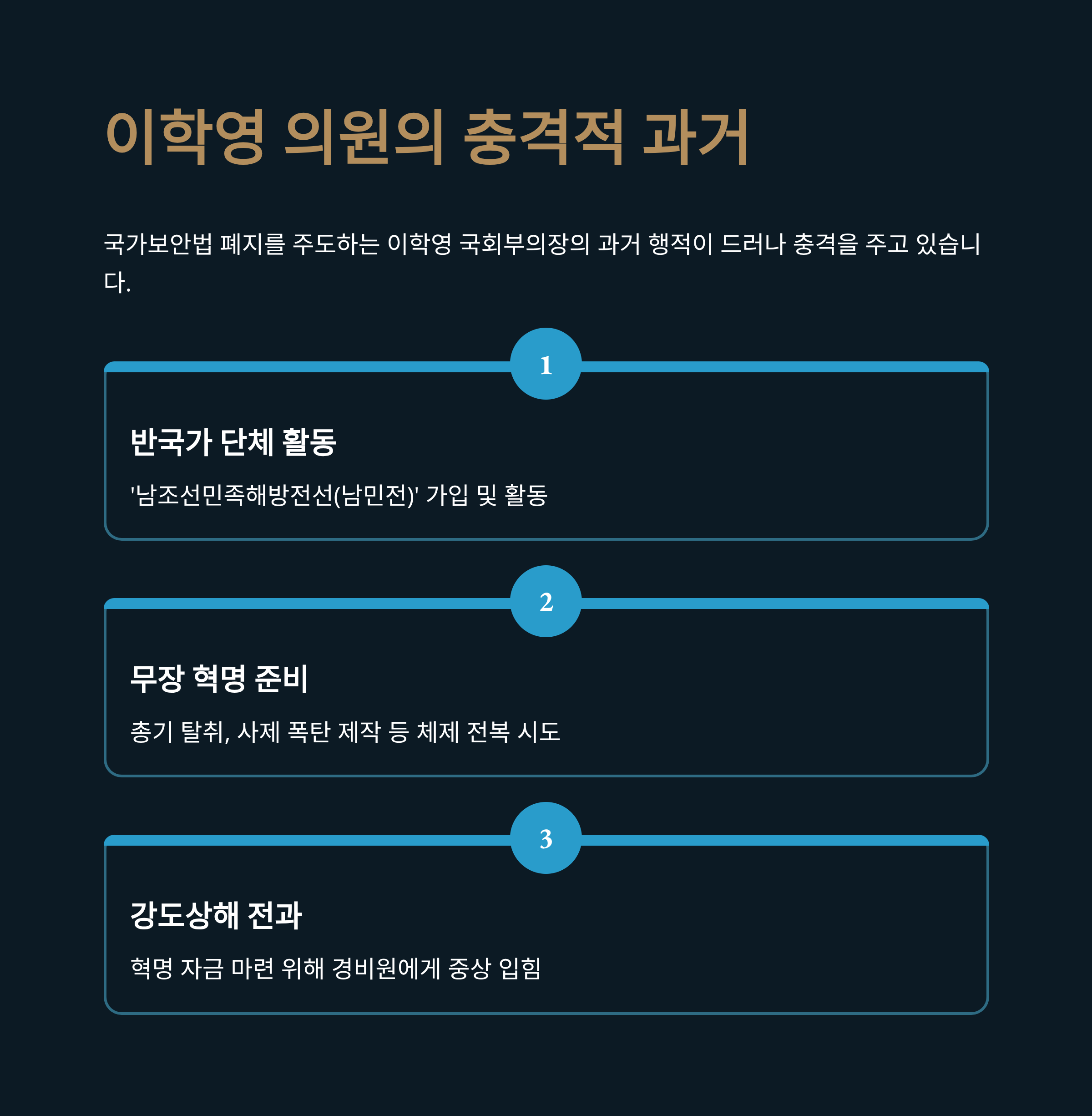 윤석열 대통령의 계엄 선포 당시 언급되었던 국가보안법 폐지 논란이 다시 수면 위로 떠오르고 있습니다. 국가보안법은 국가의 안전을 위태롭게 하는 반국가 활동을 규제하여 대한민국의 안전과 국민의 생존 및 자유를 확보하는 것을 목적으로 합니다. 이러한 법의 폐지 시도는 국가의 존립을 위협하는 행위라는 비판이 제기됩니다. 본 글에서는 국가보안법 폐지를 공동 발의한 이학영 국회부의장의 과거 행적과 그가 민주화 유공자로 인정받게 된 배경을 심층 분석합니다. 또한, 진보당이 발의한 '불법체류자 강제추방 제한법'의 문제점을 짚어보며 이들 세력의 정책 방향성을 비판적으로 고찰하고자 합니다.